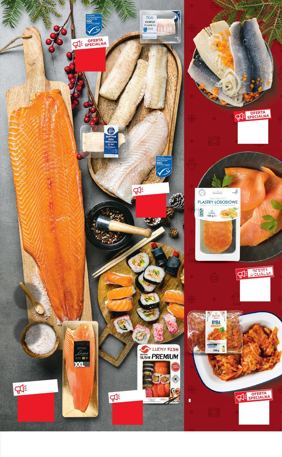 Oferta ważna od 8.12.2022 do 14.12.2022, chyba że na stronach gazety wskazano inaczej, lub do wyczerpania zapasów. Sprzedaż w ilościach detalicznych. Wszystkie podane ceny wyrażone są w złotych polskich. *Ze zrównoważonych połowów posiadających certyfikat MSC. www.msc.org/pl * STOISKO Z OBSŁUGĄ * -37% 2,69 1,69 TANIO TA-0% ANIO 0% tylko 9,89 OFERTA SPECJALNA tylko 6,59 TANIO -10% 9,99 8,99 OFERTA SPECJALNA tylko 5,59 -11% 8,99 7,99 OFERTA SPECJALNA tylko 26,99 Ryba po grecku 500 g opakowanie (=1 KG 19,78) ARCTICFISH Plastry łososiowe wędzone na zimno 100 g opakowanie (=1 KG 89,90) Dorsz atlantycki polędwica 100 g CONNOISSEUR Łosoś atlantycki XXL filet ze skórą 100 g Miruna nowozelandzka filet bez skóry 100 g Filety śledziowe marynowane Bismarck 100 g LUCKY FISH Zestaw sushi Premium 500 g opakowanie (=1 KG 53,98) S19-PL-KW49-LFT-FISCH_RE-1020-10 19