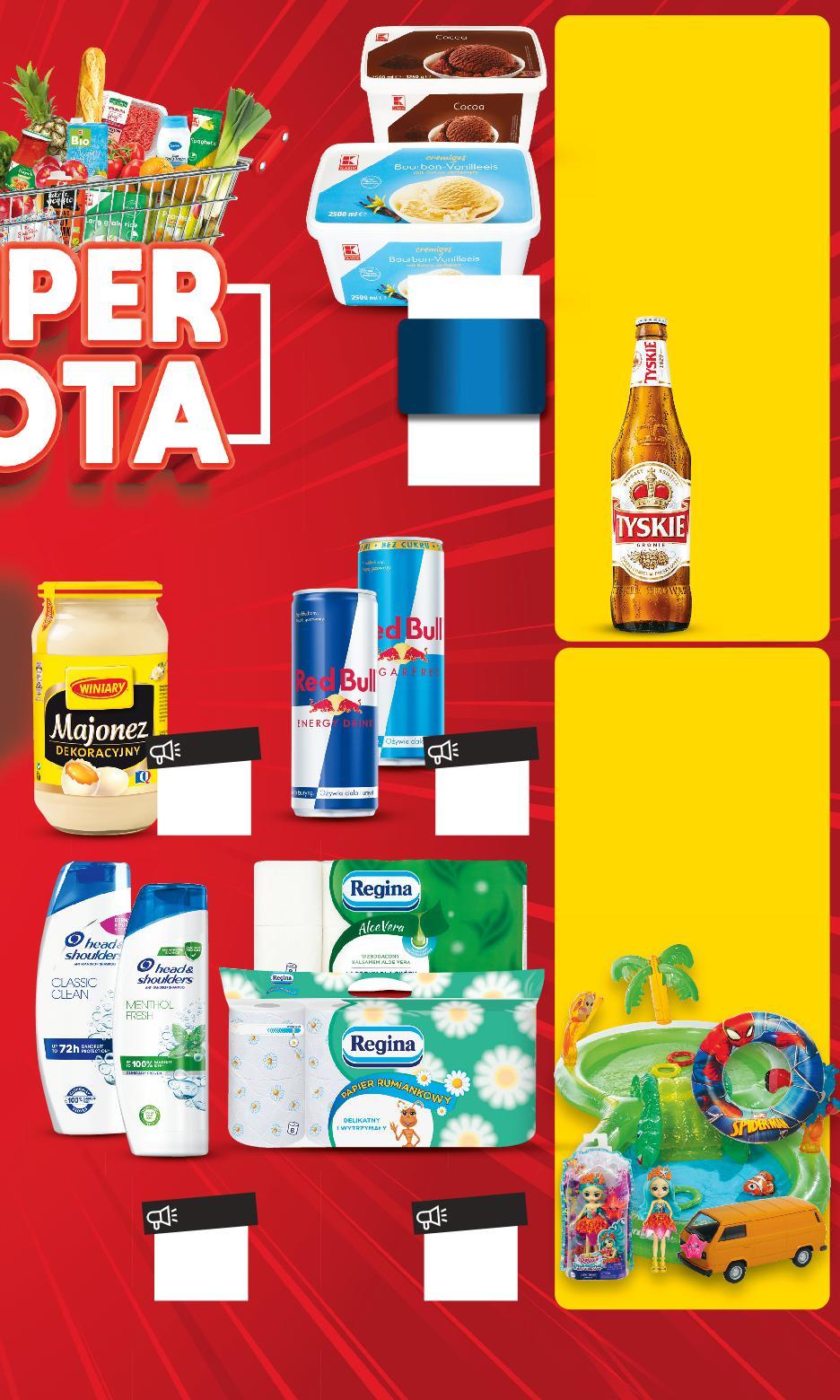 15 07 2023 . Oferta ważna tylko w sobotę 15.07.2023 do wyczerpania zapasów. Sprzedaż w ilościach detalicznych. Wszystkie podane ceny wyrażone są w złotych polskich. WSZYSTKIE ZABAWKI I DMUCHAŃCE KUP GRATIS 7+3 KUP GRATIS 2+1 NAJTAŃSZY I TANIO tylko 11,99 TANIO tylko 25,49 TANIO tylko 9,99 TANIO tylko 4,79 cena bez karty cena sprzed pierwszej obniżki -26% 10,99 14,99 9,99* -33% Z KARTĄ * Cena naliczana przy kasie. Uwaga! Łączymy oferty! Zdjęcia poglądowe. REGINA Papier toaletowy 3-warstwowy, rumiankowy, aloesowy 4 lub 8 rolek opakowanie (=1 SZT. 3,00/1,50) HEAD & SHOULDERS Szampon do włosów wybrane rodzaje 540 ml opakowanie (=100 ML 4,72) WINIARY Majonez dekoracyjny 700 ml słoik (=100 ML 1,43) RED BULL Napój energetyzujący wybrane rodzaje 0,25 l puszka (=1 L 19,16) PRODUKT MROŻONY 1/2 LITRA PIWA ZAWIERA 25 GRAMÓW CZYSTEGO ALKOHOLU ETYLOWEGO. SPRZEDAŻ ALKOHOLU OSOBOM DO LAT 18 JEST PRZESTĘPSTWEM. Z wyłączeniem LEGO. Artykuły LEGO nie biorą udziału w akcji. TYSKIE GRONIE Piwo 5,2% alk. 0,5 l butelka zwrotna Lody waniliowe, neapolitańskie, czekoladowe 2500 ml opakowanie (z kartą =100 ML 0,40) (bez karty =100 ML 0,44) S3-PL-KW28-LFT-superlup_RE-1020-10 3
