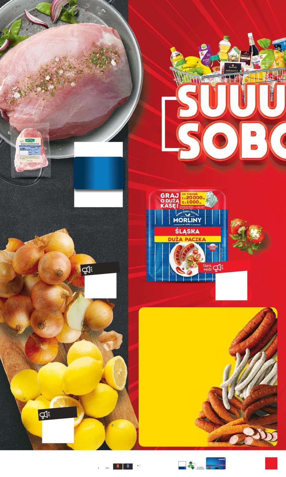 SOBOTA Darmowy INTERNET w markecie GDZIE SUPER SOBOTĘ MAM? TANIO tylko 5,99 TANIO tylko 2,49 -60% 9,90 cena sprzed pierwszej obniżki 24,90 * Cena wyłącznie na pierwszy paragon dziennie, naliczana przy kasie cena bez karty lub powyżej 5 kg z kartą cena sprzed pierwszej obniżki 18,94 Z KARTĄ -31% do 5 kg 12,99* 18,94 MORLINY Kiełbasa śląska 1 kg Cebula żółta 1 kg Cytryny luzem 1 kg K-STOISKO MIĘSNE Szynka wieprzowa bez kości, idealna do pieczenia lub na steki, opakowanie vacuum 1 kg