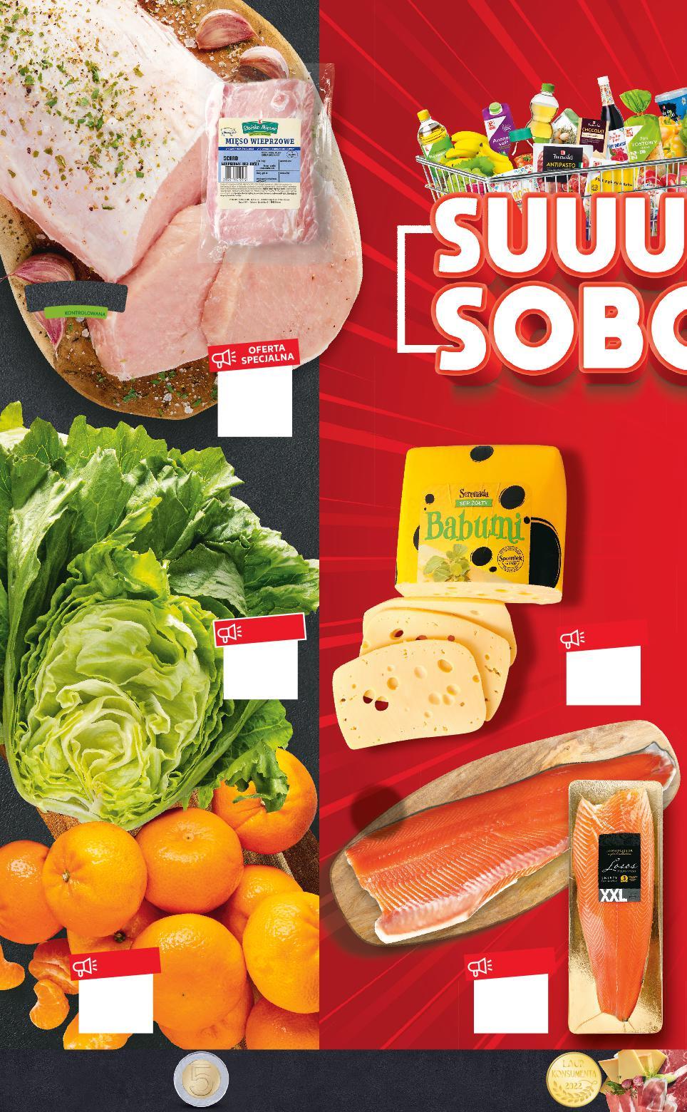 SOBOTA Stałeś w kolejce przy ladzie dłużej niż 5 minut, a nie wszystkie stanowiska przy wagach były obsadzone? Otrzymasz bon o wartości 5 zł! TWÓJ CZAS NA WAGĘZŁOTA! Schab wieprzowy bez kości najlepszy do pieczenia lub na steki, opakowanie vacuum 1 kg GDZIE SUPER SOBOTĘ MAM? TANIO tylko 6,99 TANIO tylko 3,49 TANIO tylko 4,99 TANIO tylko 3,19 tylko 11,99 TANIO CENA powyżej 5 kg 16,95 CONNOISSEUR Łosoś atlantycki XXL filet ze skórą 100 g (=1 KG 69,90) Mandarynki luzem 1 kg Sałata lodowa sztuka STOISKO SAMOOBSŁUGOWE Rabat naliczany przy kasie. Przy zakupie powyżej 5 kg lub nabyciu na drugi i następne paragony obowiązuje cena 16,95. 5 kg maksymalnie na osobę i paragon STOISKO Z OBSŁUGĄ SPOMLEK SERENADA Ser Babumi 100 g S2-PL-KW03-LFT-superlup_LI-1020-10 2