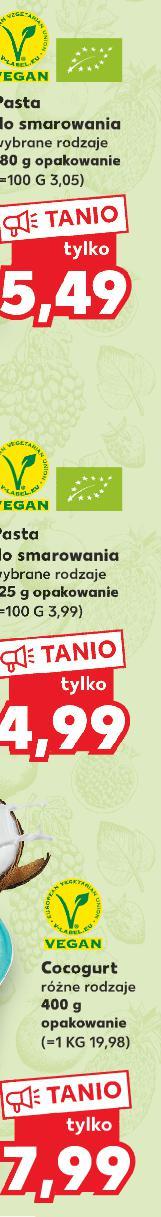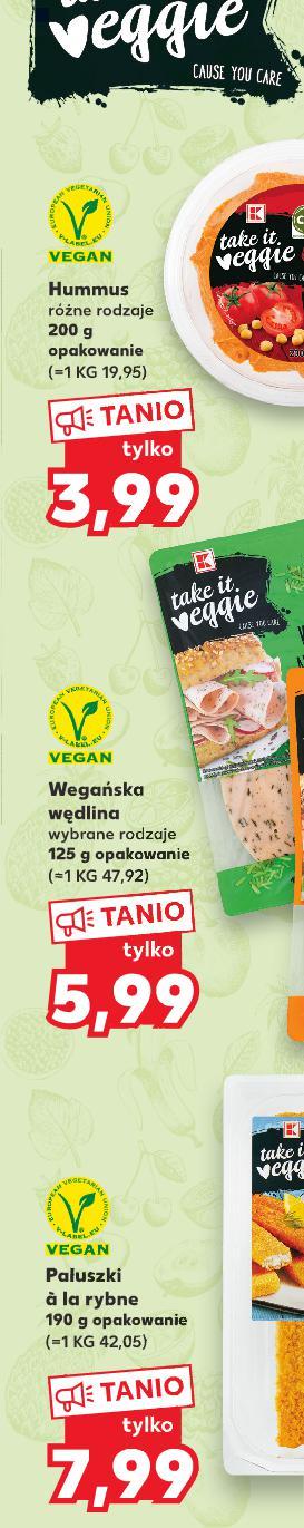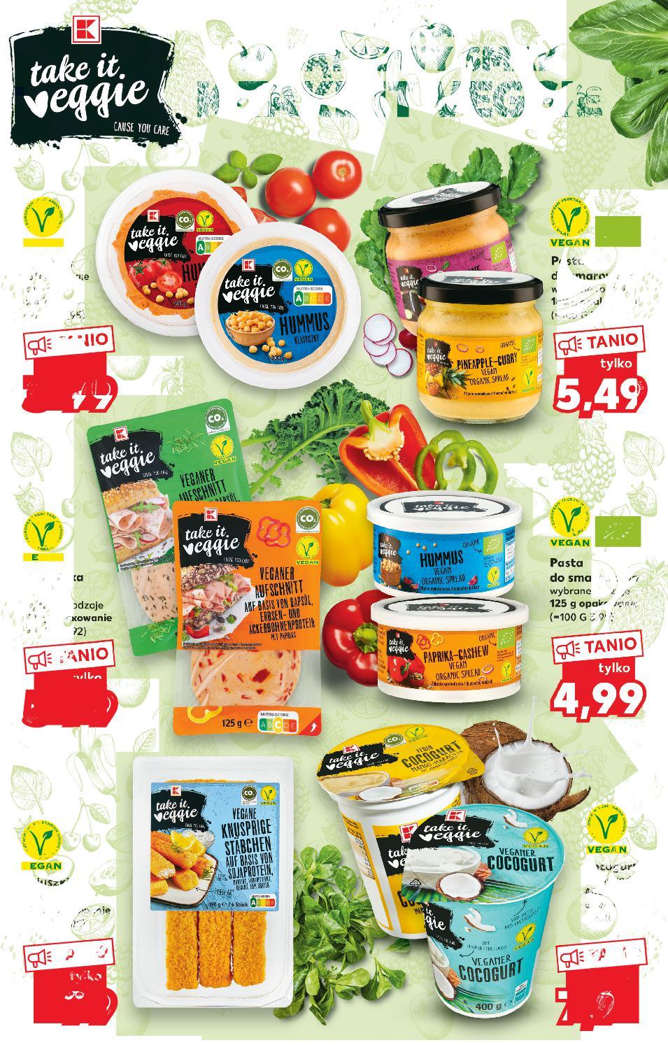 Oferta ważna od 19.01.2023 do 25.01.2023, chyba że na stronach gazety wskazano inaczej, lub do wyczerpania zapasów. Sprzedaż w ilościach detalicznych. Wszystkie podane ceny wyrażone są w złotych polskich. Cocogurt różne rodzaje 400 g opakowanie (=1 KG 19,98) Paluszki à la rybne 190 g opakowanie (=1 KG 42,05) T O tylko 3 99 3,99 T O tylko 5 99 5,99 T O tylko 7 99 7,99 T O 5 49 9 TANIO Hummus różne rodzaje 200 g opakowanie (=1 KG 19,95) Wegańska wędlina wybrane rodzaje 125 g opakowanie (=1 KG 47,92) Pasta do smarowania wybrane rodzaje 180 g opakowanie (=100 G 3,05) Pasta do smarowania wybrane rodzaje 125 g opakowanie (=100 G 3,99) O OC WYJĄTKOWY SMAK K-TAKE IT VEGGIE TANIO tylko 7 99 7,99 S29-PL-KW03-LFT-BIO_VEGGIE_RE-1020-10 29
