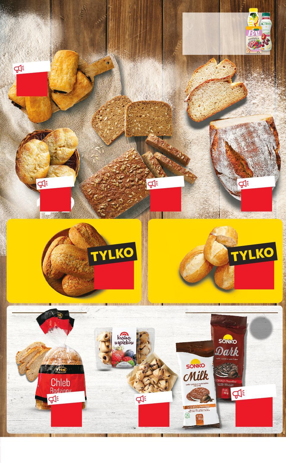 NA STOISKU Z PIECZYWEM ZNAJDZIESZ RÓWNIEŻ Oferta ważna od 19.01.2023 do 25.01.2023, chyba że na stronach gazety wskazano inaczej, lub do wyczerpania zapasów. Sprzedaż w ilościach detalicznych. Wszystkie podane ceny wyrażone są w złotych polskich. *Ze zrównoważonych połowów posiadających certyfikat MSC. www.msc.org/pl Więcej w gazecie online Różnorodność produktów na pyszne śniadania! KRAINA WYPIEKÓW Ciastka z nadzieniem różne rodzaje 200/220/250 g opakowanie (=100 G 4,25/3,86/3,40) Chałka mini 100 g TANIO tylko 2,99 TANIO tylko 1,69 TANIO tylko 3,99 TANIO tylko 8,49 TANIO tylko 2,69 TANIO tylko 1,79 przy zakupie 6 szt. /sztuka cena regularna 0,52 -33% 0,79 TANIO tylko 2,99 Chleb żytnio-pszenny z ziarnami słonecznika 480 g sztuka (=100 G 0,63) Bułka pszenna 65 g sztuka (przy 6 szt. =100 G 0,80) (cena reg. =100 G 1,22) Chleb wiejski 500 g sztuka (=100 G 0,80) Pasztecik pieczarkowy 110 g sztuka (=100 G 1,54) VITAL Chleb rodzinny 500 g opakowanie (=100 G 0,54) KUP GRATIS 4+2 Rabat naliczany przy kasie. przy zakupie 6 szt. /sztuka cena regularna 0,46 -33% 0,69 Bułka grahamka 70 g sztuka (przy 6 szt. =100 G 0,66) (cena reg. =100 G 0,99) KUP GRATIS 4+2 Rabat naliczany przy kasie. SONKO Wafle ryżowe różne smaki 65 g opakowanie (=100 G 4,60) GDZIE ŚWIEŻE PIECZYWO MAM? S23-PL-KW03-LFT-FRP_2_RE-1020-10 23