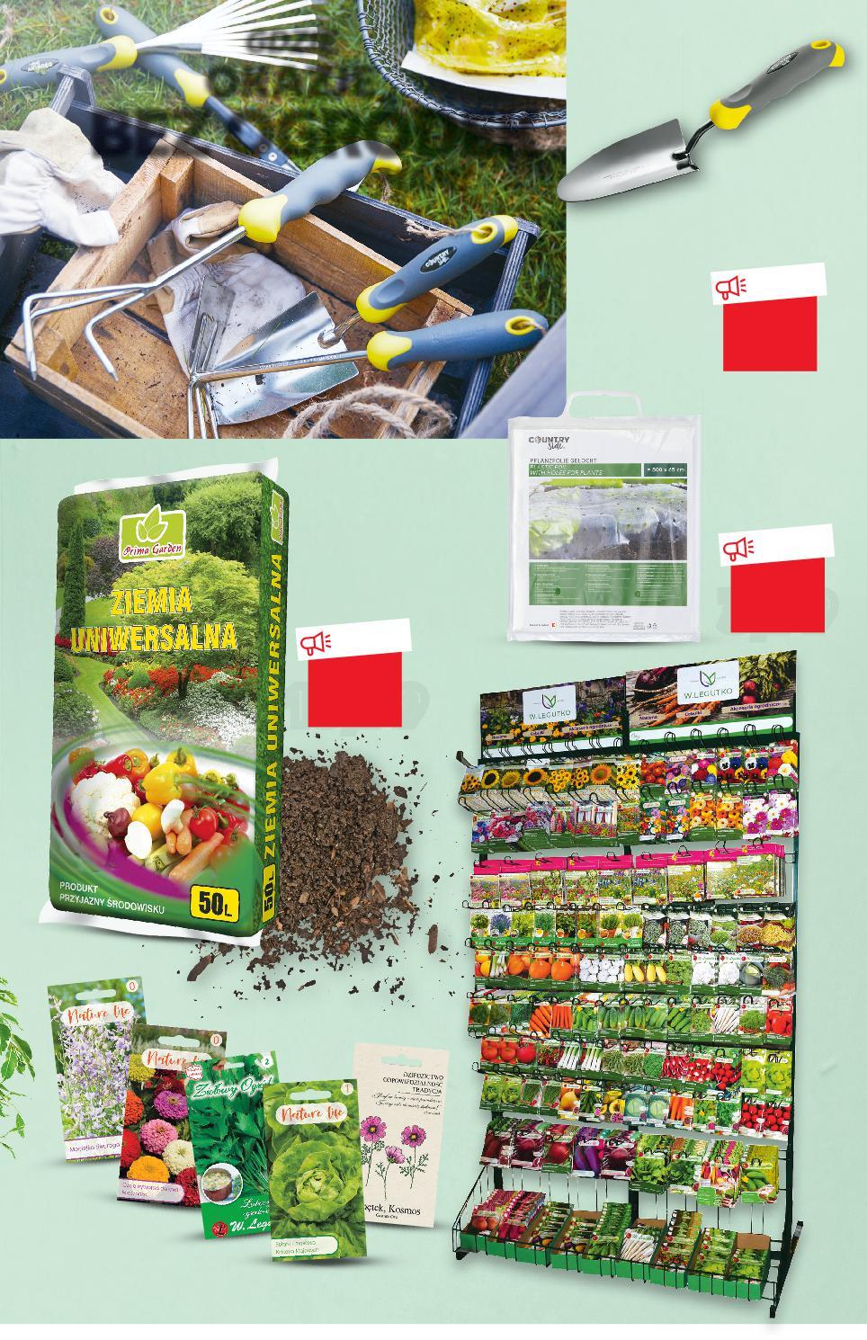 Oferta ważna od 19.01.2023 do 25.01.2023, chyba że na stronach gazety wskazano inaczej, lub do wyczerpania zapasów. Sprzedaż w ilościach detalicznych. Wszystkie podane ceny wyrażone są w złotych polskich. COUNTRYSIDE® Łopatka stalowa z nierdzewnej stali szlachetnej, ergonomicznie ukształtowana rękojeść z możliwością zawieszenia Folia ogrodowa wym. 500 x 65 cm TANIO tylko 11,99 TANIO tylko 13,99 TANIO tylko 3,99 Ziemia uniwersalna 50 l (=1 L 0,28) Nasiona kwiatów, warzyw, owoców różne rodzaje 1,49 cena od GDZIE OKAZJEBEZ OGRÓDEK MAM? S11-PL-KW03-LFT-KWIATY_RE-1020-10 11