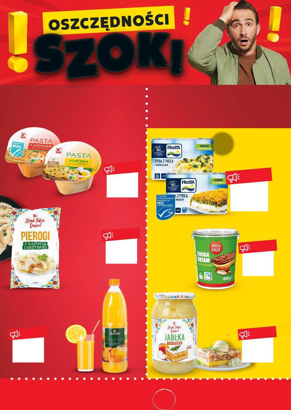 SUPER–PRODUKTY W DYSKONTOWYCH CENACH 1 ZAWSZE TANIE I DOBRE ARTYKUŁY MAREK WŁASNYCH + + * * * Produkty marek własnych oraz produkty oznaczone żółtymi etykietami – w naprawdę niskich regularnych cenach. Ponad 4500 produktów w dyskontowych cenach oznaczonych żółtymi etykietami Ponad 3500 produktów marek własnych zawsze tanio ** Ze zrównoważonych połowów posiadających certyfikat MSC. www.msc.org/pl *** Produkt spełnia standardy ASC w zakresie odpowiedzialnej hodowli ryb i owoców morza. www.asc-aqua.org lub 649°P TANIO tylko 6,49 lub 1299°P TANIO tylko 12,99 lub 679°P TANIO tylko 6,79 lub 259°P TANIO tylko 2,59 lub 899°P TANIO tylko 8,99 lub 699°P TANIO tylko 6,99 K-FAVOURITES Sok 100% pomarańczowy bezpośrednio wyciskany, mętny 1 l butelka STILLA DOLCE Krem do smarowania orzechowy, kakaowy 400 g opakowanie (=100 G 1,70) FROSTA Ryba z pieca wybrane rodzaje 330–375 g opakowanie (=1 KG 39,36–34,64) K-CLASSIC Pasta różne rodzaje 80 g opakowanie (=1 KG 32,38) K-STĄD TAKIE DOBRE Jabłka prażone 900 g słoik (=100 G 0,78) PRODUKT MROŻONY K-STĄD TAKIE DOBRE Pierogi z kapustą i grzybami 1 kg opakowanie PRODUKT MROŻONY *** ** S12-PL-KW03-LFT-Koszyk_LI-1020-10 12