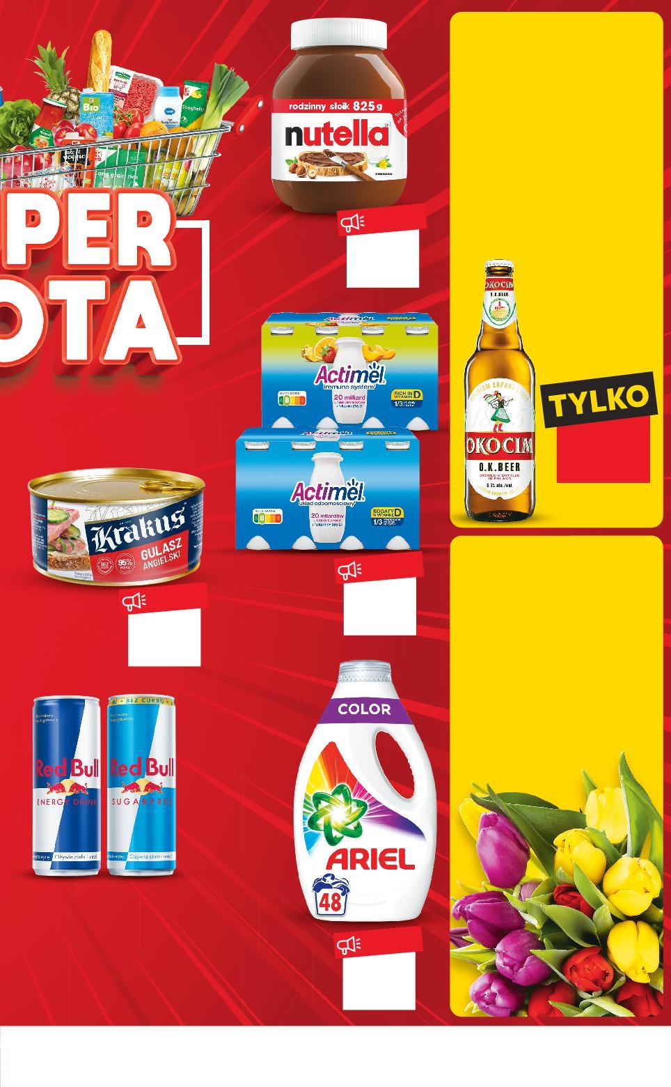 21 01 202 . -25% WSZYSTKIE BUKIETY TULIPANÓW CIĘTYCH Rabat naliczany przy kasie. r. Oferta ważna tylko w sobotę 21.01.2023 do wyczerpania zapasów. Sprzedaż w ilościach detalicznych. Wszystkie podane ceny wyrażone są w złotych polskich. KUP GRATIS 7+3 TANIO tylko 10,99 TANIO tylko 21,99 TANIO tylko 36,99 TANIO tylko 6,49 KUP ZAPŁAĆ 2 MNIEJ Rabat naliczany przy kasie. przy zakupie 2 szt. 4,49 /sztuka 5,49 cena regularna DRUGI PRODUKT TANIEJ 36% przy zakupie 10 szt. /sztuka cena regularna Rabat naliczany przy kasie. 2,09 -30% 2,99 1/2 LITRA PIWA ZAWIERA 25 GRAMÓW CZYSTEGO ALKOHOLU ETYLOWEGO. SPRZEDAŻ ALKOHOLU OSOBOM DO LAT 18 JEST PRZESTĘPSTWEM. FERRERO NUTELLA Krem 825 g słoik (=100 G 2,67) ARIEL Proszek, Płyn lub Kapsułki do prania wybrane rodzaje 2,47 kg/2,145/2,64 l/ 26/31 sztuk opakowanie (=1 l 17,24/14,01/ =1 kg 14,98/ =1 szt. 1,42/1,19) DANONE Actimel różne smaki 8 x 100 g opakowanie (=1 KG 13,74) KRAKUS Gulasz angielski 300 g puszka (=100 G 2,17) OKOCIM O.K. BEER Piwo 5,6% alk. 0,5 l butelka zwrotna (przy 10 szt. =1 L 4,18) (cena reg. =1 L 5,98) dł. 35 cm RED BULL Napój energetyzujący wybrane rodzaje 0,25 l puszka (przy 2 szt. =1 L 17,96) (cena reg. =1 L 21,96) Limit – 6 bukietów na osobę. S3-PL-KW03-LFT-superlup_RE-1020-10 3