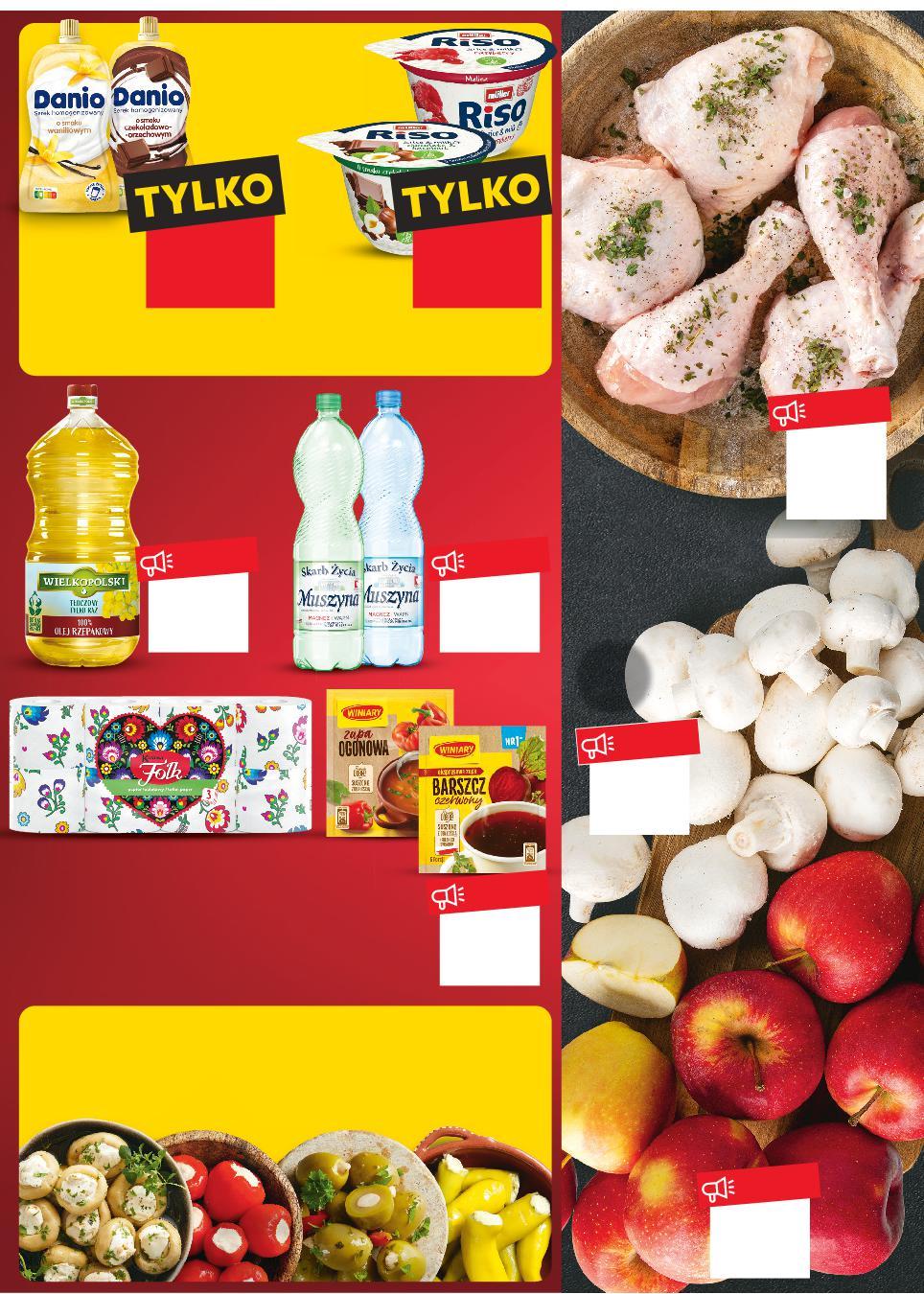 Oferta ważna od 23.01 do 25.01.2023, chyba że na stronach gazety wskazano inaczej, lub do wyczerpania zapasów. Sprzedaż w ilościach detalicznych. Wszystkie podane ceny wyrażone są w złotych polskich. MOCNY START OD PONIEDZIAŁKU 23.01 DO ŚRODY 25.01 Uwaga! Nie łączymy ofert! Oferta z gazety nie łączy się z innymi ofertami przeprowadzanymi przez Kaufland. Zdjęcia poglądowe. WSZYSTKIE ANTIPASTI Z NASZEJ LADY -20% Limit – 2 kg na osobę dziennie. Rabat naliczany przy kasie. TANIO tylko 27,99 TANIO tylko 1,59 TANIO tylko 1,19 TANIO tylko 6,99 TANIO tylko 1,79 tylko 6,99 TANIO CENA powyżej 3 kg 11,99 przy zakupie 3 szt. /sztuka cena regularna Rabat naliczany przy kasie. 1,99 -33% 2,99 przy zakupie 3 szt. /sztuka cena regularna Rabat naliczany przy kasie. 1,92 -33% 2,89 Z GRUNTU POLSKIE 12,99 najniższa cena z 30 dni przed obniżką 10,99 dotychczasowa cena 12,99 -15% STOISKO Z OBSŁUGĄ WINIARY Zupa w proszku wybrane rodzaje 40–75 g opakowanie (=100 G 3,98–2,12) MUSZYNA Woda mineralna gazowana, lekko gazowana 1,5 l butelka (=1 L 0,80) KARTIKA Papier toaletowy 3-warstwowy 8 sztuk opakowanie (=1 SZT. 1,37) WIELKOPOLSKI Olej rzepakowy 3 l opakowanie (=1 L 9,33) Polskie jabłka Ligol, Jonagold, Szampion, luzem 1 kg Polskie pieczarki 500 g + 200 g gratis opakowanie (=1 KG 9,99) DANIO Serek w saszetce różne rodzaje 120 g opakowanie (przy 3 szt. =1 KG 16,59) (cena reg. =1 KG 24,92) KUP 2+1 GRATIS MÜLLER Ryż na mleku różne smaki 200 g opakowanie (przy 3 szt. =1 KG 9,60) (cena reg. =1 KG 14,45) Rabat naliczany przy kasie. Przy zakupie powyżej 3 kg lub nabyciu na drugi i następne paragony obowiązuje cena 11,99. 3 kg maksymalnie na osobę i paragon Udo lub Podudzie z polskiego kurczaka 1 kg 700 g S52-PL-KW03-LFT-RS-1020-10