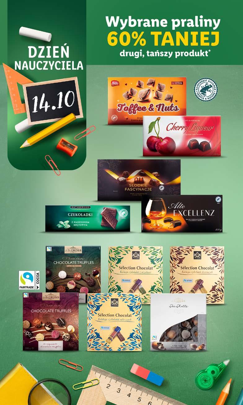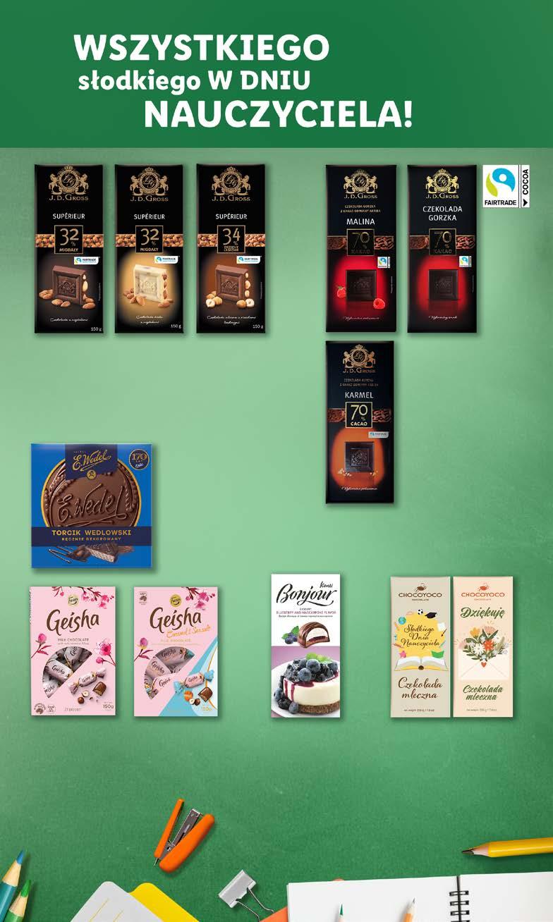 KONTI BONJOUR D eser w czekoladzie 232 g/1 opak. jagoda-mascarpone lub truskawka (3,88 zł/100 g) SUPERCENA 8,99 FAZER Cukierki z nadzieniem orzechowym Geisha 150 g/1 opak. różne rodzaje (7,33 zł/100 g) SUPERCENA 10,99 CZEKOLADY J.D. GROSS, 125 G 3 W CENIE2 MIKSUJ DOWOLNIE 150 g 7,99 J.D. GROSS Czekolada Superiéur z migdałami lub z orzechami laskowymi 150 g/1 opak. różne rodzaje (5,33 zł/100 g) CHOCOYOCO Czekolada „Dzień Nauczyciela” 200 g/1 opak. różne rodzaje (3,50 zł/100 g) Aż 200 g 6,99 E. WEDEL Torcik Wedlowski 250 g/1 opak. (6,00 zł/100 g) SUPERCENA 14,99 DO SOBOTY, 14.10 DO SOBOTY, 14.10 Rabat 33% nalicza się na każde z 3 opakowań. 13 Artykuły