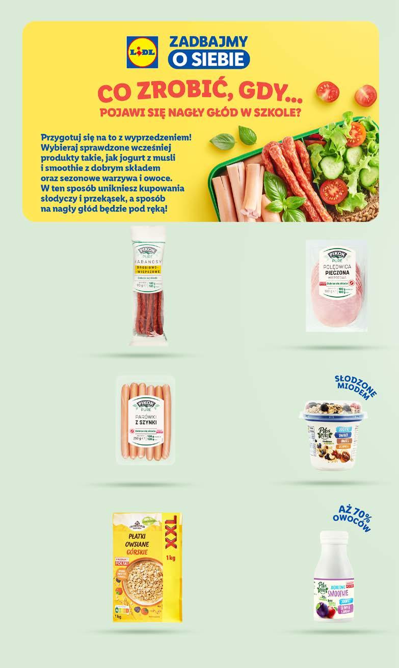 NAPOJE KINGA PIENIŃSKA Woda mineralna niegazowana*** 1,5 L/1 but. (1,06 zł/1 L) SUPERCENA 1,59 OLEOFARM Sok 100% tłoczony 490 ml/1 but. pigwa, czarny bez lub granat (40,80 zł/1 L) SUPERCENA 19,99 SOLEVITA Ice Tea, herbata mrożona, 20% soku 1,5 L/1 but. mango lub malina (1,99 zł/1 L) SUPERCENA 2,99 * najniższa cena z 30 dni przed obniżką: 7,99 zł/1 but. (15,98 zł/1 L) SOLEVITA Sok tłoczony na zimno metodą HPP 500 ml/1 but. ananas-melon-mango lub jabłko-pomarańcza-truskawka ** cena za 1 but. przy zakupie 2 but.: 5,99 zł/1 but. (11,98 zł/1 L) 50% TANIEJ DRUGI PRODUKT 5,99** 7,99* 7,25 ZŁ ZA 1 BUT. W 2-PAKU 2 x 2,5 L 14,49 Pepsi Max, Mirinda lub 7UP, XXL*** 2 x 2,5 L/1 pak (2,90 zł/1 L) * najniższa cena z 30 dni przed obniżką: 1,19 zł/1 but. (3,61 zł/1 L) SAGUARO Woda źródlana niegazowana ze sportowym korkiem 330 ml/1 but. ** cena za 1 but. przy zakupie 3 but.: 0,89 zł/1 but. (2,70 zł/1 L) Limit: 9 but. na ofertę. Każda kolejna butelka będzie sprzedawana w najniższej cenie sprzed 30 dni przed obniżką. Szczegóły promocji dostępne w aplikacji Lidl Plus. 75% TANIEJ TRZECI PRODUKT 0,89** 1,19* DO SOBOTY, 14.10 ZERO CUKRU *** Produkt dostępny w wybranych sklepach. Sprawdź dostępność w sklepie w czasie obowiązywania promocji. 43 Artykuły