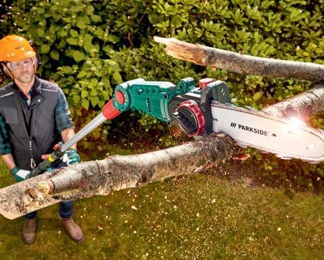 KOMPATYBILNA ZE WSZYSTKIMI AKUMULATORAMI SERII „PARKSIDE X 20 V TEAM“ 1 zestaw do bezprzewodowego piłowania do wys. 4 m • w zestawie: osłona miecza, narzędzie montażowe, 100 ml ekologicznego smaru do łańcucha PRĘDKOŚĆ ŁAŃCUCHA MAKS. 5 M/S DŁ. CAŁKOWITA OK. 2,7 M Ø CIĘCIA OK. 20 CM Z WYŁĄCZNIKIEM BEZPIECZEŃSTWA W UCHWYCIE DO GAŁĘZI O Ø DO 20 CM TWÓJ OGRÓD PRZECHYLANA GŁOWICA UMOŻLIWIA CIĘCIE W TRUDNO DOSTĘPNYCH MIEJSCACH RURA TELESKOPOWA WYDŁUŻANA O 82 CM Ł * *Szczegóły str. 22 BRAK W ZESTAWIE AKUMULATORA Artykuły prezentowane w materiale reklamowym znajdują się w sprzedaży w okresie jego obowiązywania albo według dat podanych przy produktach lub do wyczerpania zapasów. Ceny artykułów bez dekoracji. Sprzedaż artykułów tylko w ilościach detalicznych. Znaki firmowe i towarowe należą do ich właścicieli. R 41/22 31