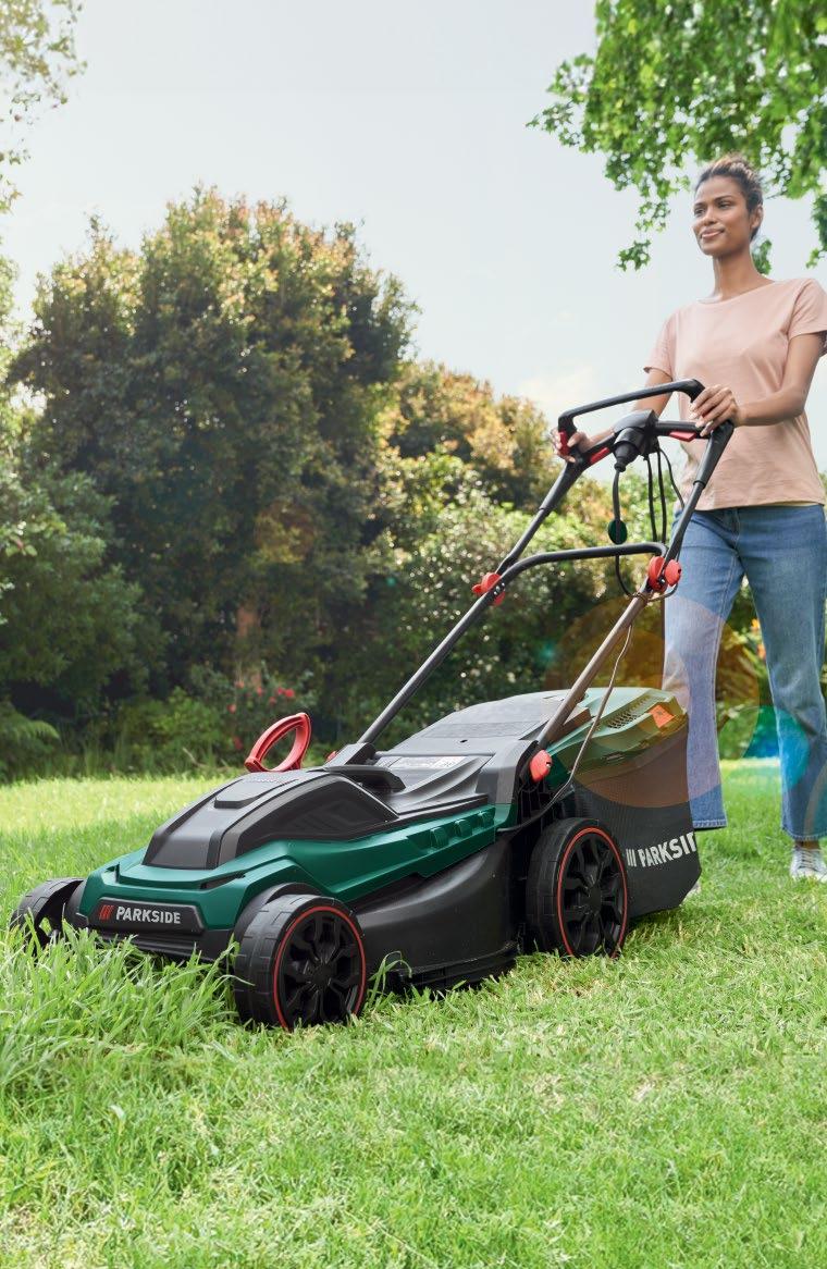 ergonomiczne uchwyty z powłoką Softgrip obustronny ogranicznik boczny do koszenia obrzeży funkcja hamowania noża 3 stopnie regulacji cięcia PARKSIDE® Elektryczna kosiarka 1200 W
