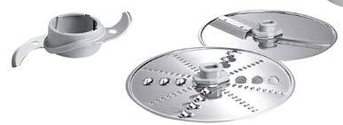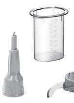 • w zestawie: pokrywa ochronna, miska o poj. 500 ml, dzbanek miksera o poj. 2,3 l, popychacz, uchwyty, nóż uniwersalny oraz tarcze: do tarcia, do ubijania i do cięcia