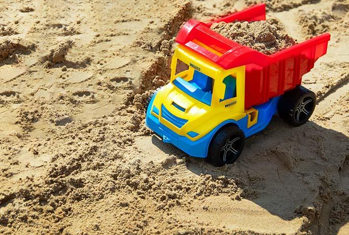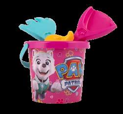 w zestawie wiaderko, łopatka, grabki, foremka i statek