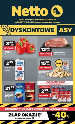 ZŁAP OKAZJĘ! TANIEJ! 40%DO PRODUKTY KOSMETYCZNE I PIELĘGNACYJNE SZCZEGÓŁY NA STRONIE 19 15 99 23% TANIEJ 2099 Pistacje prażone solone XXL Makar 300 g 53,30/1 kg Najniższa cena z 30 dni przed wprowadzeniem obniżki: 20,99 8 99 42% TANIEJ 1569 12 99 34% TANIEJ od 8.04 do 10.04.2024 1979 Łopatka wieprzowa 1 kg Cena promocyjna do 6 kg. Papryka czerwona luz 1 kg 21 99 > Kawa mielona Prima Finezja > Kawa mielona MK Café Premium 500 g 43,98/1 kg 2 99 Mleko UHT 3,2% Uchate Polmlek 1 l 300 g CENA ZA 1 SZT. PRZY ZAKUPIE 6 SZT. 2 99 29% TANIEJ* 4 25 Piwo Warka Classic puszka; 500 ml * w odniesieniu do ceny regularnej Przy zakupie 6 szt. 2,99/1 szt. (5,98/1 l) Najniższa cena z 30 dni przed wprowadzeniem obniżki: 4,25 DYSKONTOWE ASY % % OFERTA OBOWIĄZUJE OD PONIEDZIAŁKU 8.04 DO SOBOTY 13.04.2024 LUB DO WYCZERPANIA ZAPASÓW 1/2 LITRA PIWA ZAWIERA 25 GRAMÓW CZYSTEGO ALKOHOLU ETYLOWEGO SPRZEDAŻ ALKOHOLU OSOBOM DO LAT 18 JEST PRZESTĘPSTWEM