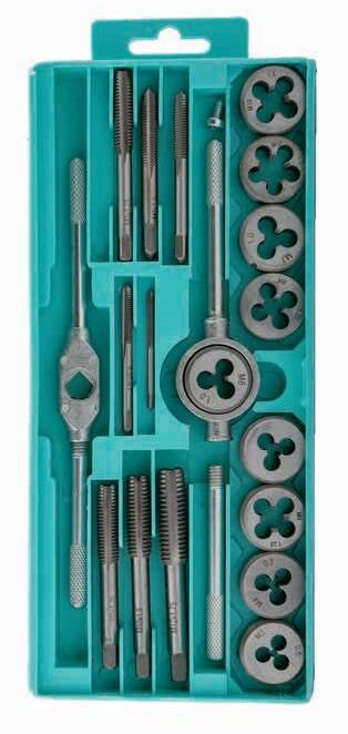 Zestaw narzynek i gwintowników > zestaw zawiera 9 narzynek metrycznych, 9 gwintowników metrycznych, pokrętło do gwintowników, oprawę do narzynek 1 kpl.