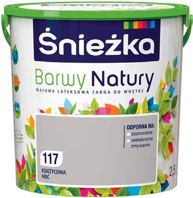 Śnieżka Barwy Natury 2,5 l farba lateksowa do wnętrz, odporna na szorowanie, matowa, wyd. do 14 m2/l, cena za 1 l = 23,60* 17,40 np. nr OBI 4199543 Dostępna również