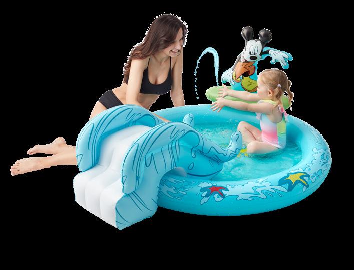 nadmuchiwany, z fontanną (wymaga podłączenia węża ogrodowego) z postacią licencyjną do wyboru: z Myszką Miki lub Stitchem, wymiary: 154 x 125 x 60 cm, dla dzieci powyzej 3 lat