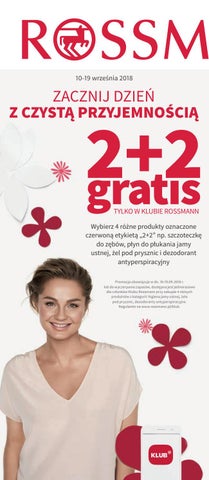 Wybierz 4 różne produkty oznaczone czerwoną etykietą „2+2” np. szczoteczkę do zębów, płyn do płukania jamy ustnej, żel pod prysznic i dezodorant antyperspiracyjny Promocja obowiązuje w dn. 10-19.09.2018 r. lub do wyczerpania zapasów, dostępna jest jednorazowo dla członków Klubu Rossmann przy zakupie 4 różnych produktów z kategorii: higiena jamy ustnej, żele pod prysznic, dezodoranty antyperspiracyjne. Regulamin na www.rossmann.pl/klub.
