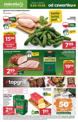Promocje cenowe nie łączą się Przekreślona cena oznacza cenę sprzed obniżki – dla towarów łatwo psujących się i z krótkim terminem przydatności, między innymi takich jak mięso, warzywa, owoce, przy czym jest to najniższa cena jaka wystąpiła przed zastosowaniem obniżek, w jakimkolwiek sklepie sieci Stokrotka w formacie supermarket i market. Określenie „Najniższa cena z ostatnich 30 dni” jest stosowane w przypadku towarów innych niż łatwo psujące się lub z krótkim terminem przydatności – cena ta jest najniższą ceną jaka obowiązywała w okresie 30 dni przed wprowadzeniem obniżki w jakimkolwiek sklepie sieci Stokrotka w formacie supermarket i market. Ceny w poszczególnych sklepach mogą się różnić. Oferta w dniach 9.05-15.05 1/2 LITRA PIWA ZAWIERA 25 GRAMÓW CZYSTEGO ALKOHOLU ETYLOWEGO. SPRZEDAŻ ALKOHOLU OSOBOM DO LAT 18 JEST PRZESTĘPSTWEM. 299/puszka przy zakupie dwóch 4-paków OGÓRKI GRUNTOWE kg KAWA MIELONA JACOBS KRÖNUNG 00 g 3 , zł kg z