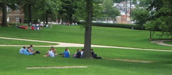John Sutton Hall (Image 1) was the first and only building when IUP (formerly known as Indiana Normal School) was founded in 1875. Aerial photographs from the 1920s (Image 2) show the area to the east of Sutton Hall designated as the “East Lawn”. This area served as a gathering place for students and continues today (150 years later) to be an area of reflection and beauty (Image 3).