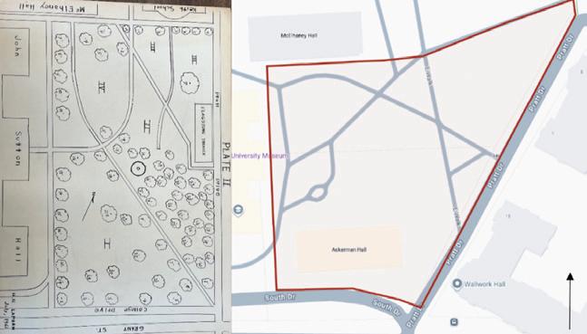 Image 4. The diagram above was drawn in 1961, and it shows the location of each tree included in the inventory. The map on the right was generated using Google Maps and shows the new boundary of the East Lawn. Images are not represented on the same scale.