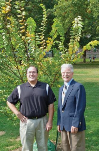 (left) Dr. Daniel J. Kupas '88 and Dr. Jerry Pickering are shown in front of an American elm tree, planted in 2014. Dr. Kupas received a cutting from the Oklahoma City tree that had survived the bombing in 1995.