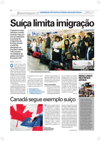 Menos oportunidades As restrições de entrada de imigrantes da Europa na Suíça trarão problemas para as pessoas que Entre janeiro e procuram uma oportunidade de novembro de 2012, emigraram para a Suíça trabalho no país, principalmente aos portugueses, afirmou Manuel 12.960 portugueses