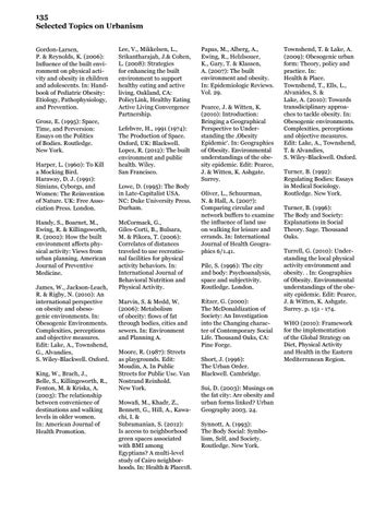 135 Selected Topics on Urbanism Gordon-Larsen, P. & Reynolds, K. (2006): Influence of the built environment on physical activity and obesity in children and adolescents. In: Handbook of Pediatric Obesity: Etiology, Pathophysiology, and Prevention. Grosz, E. (1995): Space, Time, and Perversion: Essays on the Politics of Bodies. Routledge. New York. Harper, L. (1960): To Kill a Mocking Bird. Haraway, D. J. (1991): Simians, Cyborgs, and Women: The Reinvention of Nature. UK: Free Association Press. London. Handy, S., Boarnet, M., Ewing, R. & Killingsworth, R. (2002): How the built environment affects physical activity: Views from urban planning. American Journal of Preventive Medicine. James, W., Jackson-Leach, R. & Rigby, N. (2010): An international perspective on obesity and obesogenic environments. In: Obesogenic Environments. Complexities, perceptions and objective measures. Edit: Lake, A., Townshend, G., Alvandies, S. Wiley-Blackwell. Oxford. King, W., Brach, J., Belle, S., Killingsworth, R., Fenton, M. & Kriska, A. (2003): The relationship between convenience of destinations and walking levels in older women. In: American Journal of Health Promotion.