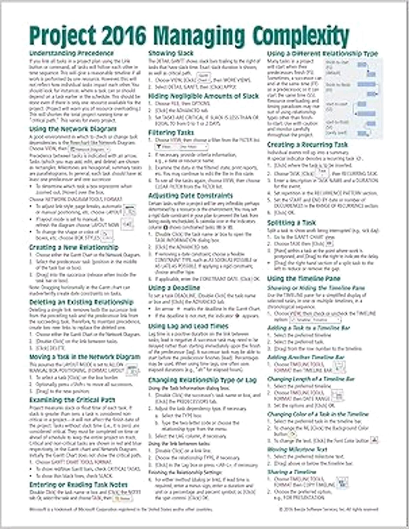 Start your journey with 'Microsoft Project 2016 Quick Reference Guide Managing Complexity - Windows Version (Cheat Sheet of Instructions, Tips & Shortcuts - Laminated Card)' by Beezix Inc.