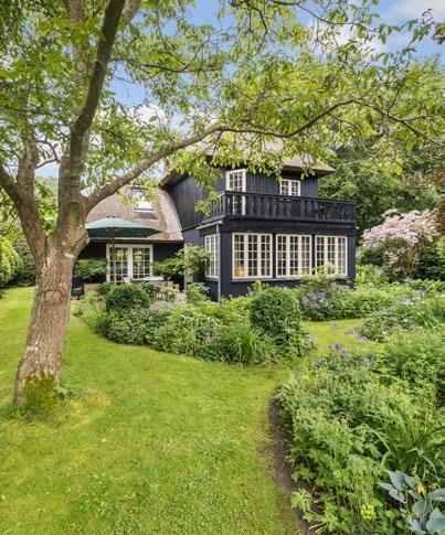alerne. Her er den mest fantastiske stue med 6-7 meter til loftet, det smukkeste trappeløb, bindingsværk, altan, håndskåret loft og originale, hollandske kakler over ildsted. Det hele står her endnu, 103 år ung og stadig så smuk og dejlig, som Anne Linnet sang lidt omskrevet i halvfjerdserne, fordi velhavende familier havde økonomi til at bygge ordentligt. Altså med mursten, stråtag og håndværk, vi ikke ser bygget mere. Huset har været ejet af samme familie siden 1924, så det er et flergenerationshus, der nu skal have en ny familie.