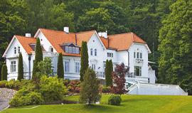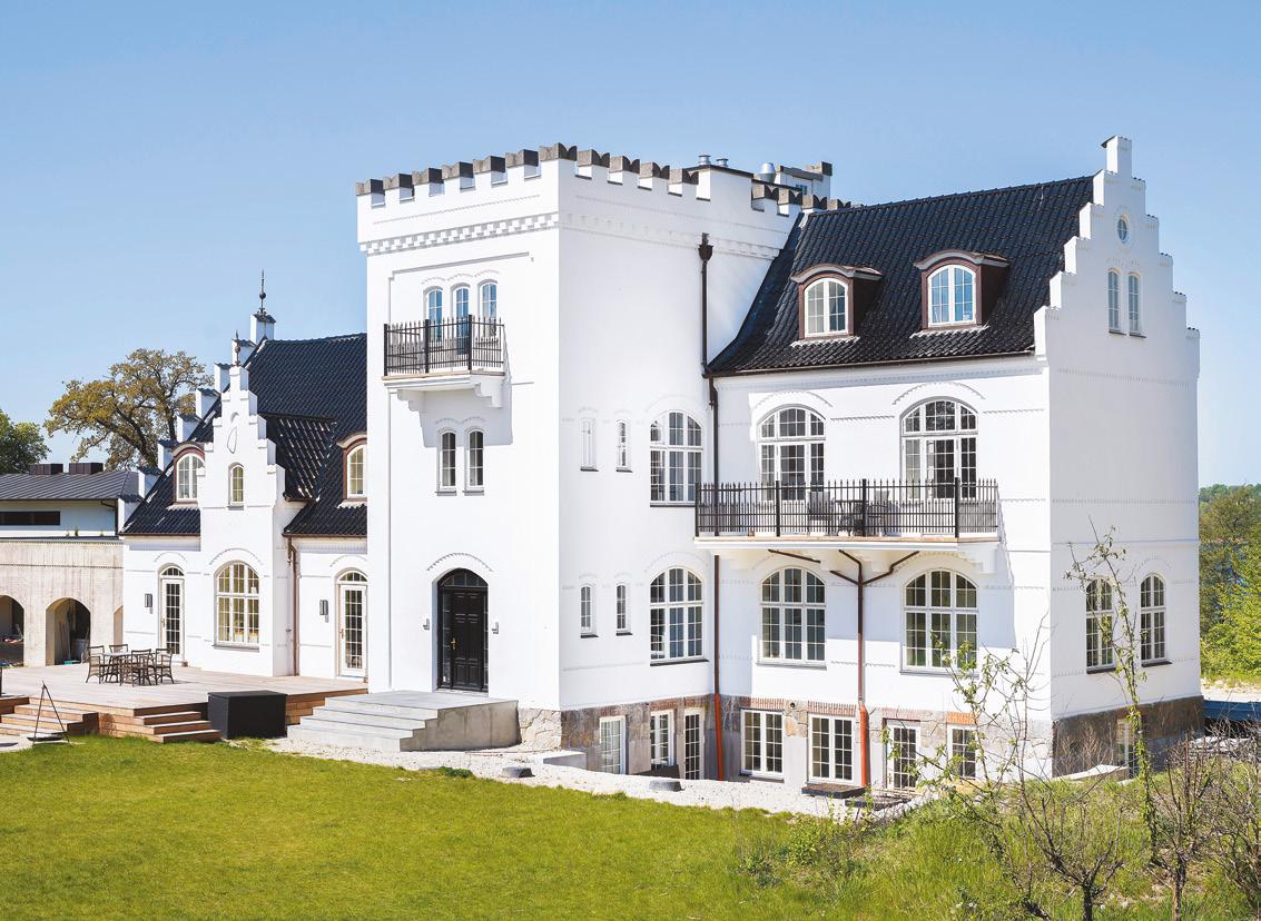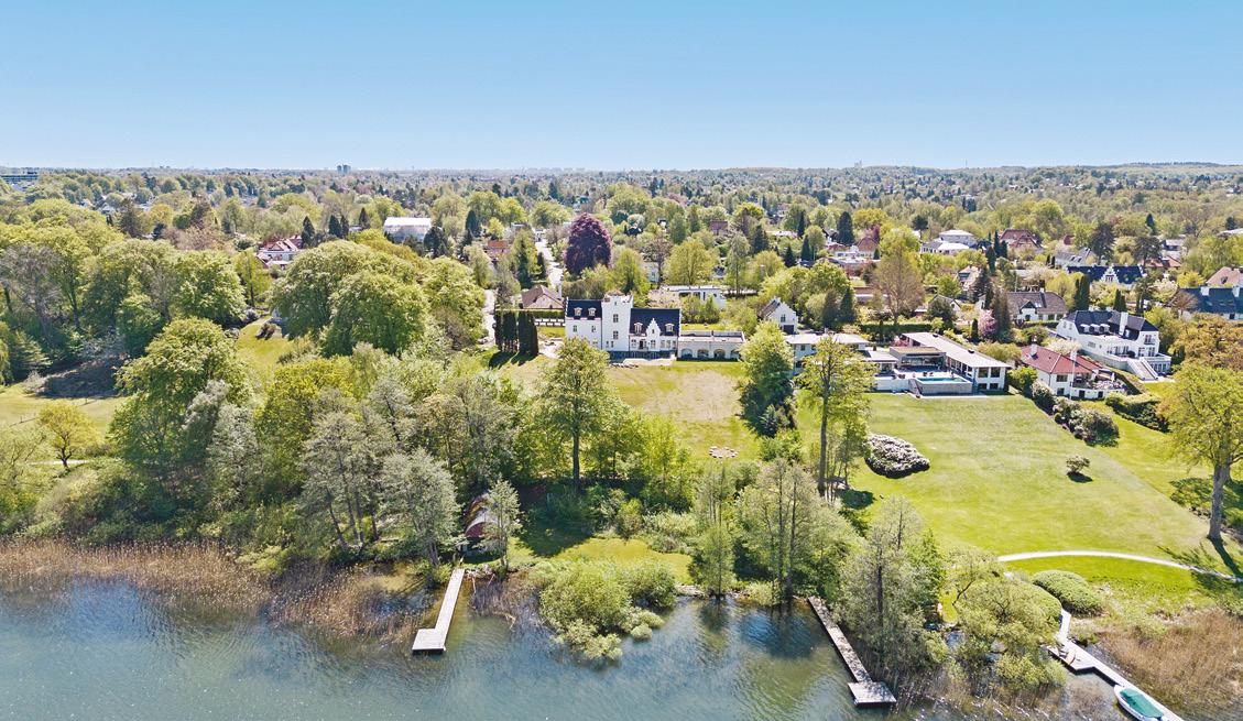 Det fortæller de tørre tal i hvert fald. Grunden er på 6.606 m2 i 1. række til søvandet. Med 689 m2 bolig skal selv den helt store familie nok finde sig til rette, og er man glad for biler, altså meget glad for biler, ja, så gemmer der sig en parkeringskælder under græsplænen på over 500 m2. Her er plads til 35 biler. Ejendommen har de seneste års tidnværet under både ombygning og tilbygning, og kan som den står nu erhverves til udbudspris. Den er en spektakulær ejendom med usædvanlige, store rum, højt til loftet og håndværksdetaljer, vi ikke ser nybygget mere. Alle håndværk er repræsenteret og der er kun brugt de bedste materialer, som Hørning sildebensparket, døre og koblede vinduer fra Linoile Døre og Vinduer, imponerende håndlavet trappeforløb fra kælder til kvist fra Thy Trapper med trin i wenge træ, belysning fra Anker og Co., alle greb er fra Søe Jensen & Co. Tagterrassen er mageløs, ganske enkelt, det samme er udsigten over søen til halvøen Verdens Ende. Ejendommen er fra 1909 bygget i nationalromantikkens arkitektur, og fremstår i dag som en af Danmarks mest eksklusive ejendomme.