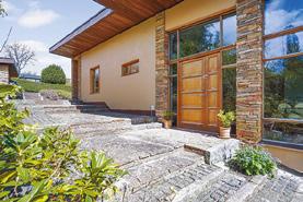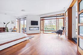 Huset på Vandtårnsvej er et af dem, der får sproget til at fordampe som vanddråber på en kogeplade. Med ro, skønhed, forkælelse, grønt og intet andet i udsigten står det højt på den højeste matrikel i terrænet. Derfor er det ikke helt tilfældigt, at den midterste facade er bygget som en 36 m2 stor glasvæg med skydedøre fra gulv til loft. Sikken udsigt, meditativ og kæbemåbende er den. Alt kommer ind, skoven, engene, himmel, terrasserum. Fra alle værelser er der overdimensionerede glasdøre til den sydvendte terrasse, hvor man fra ligge-