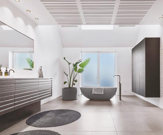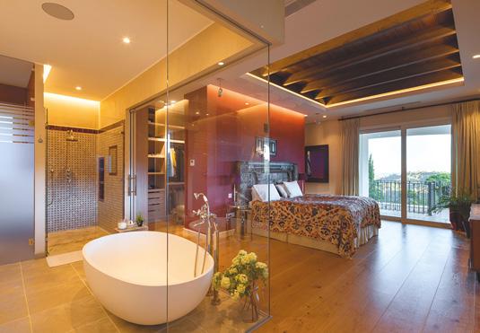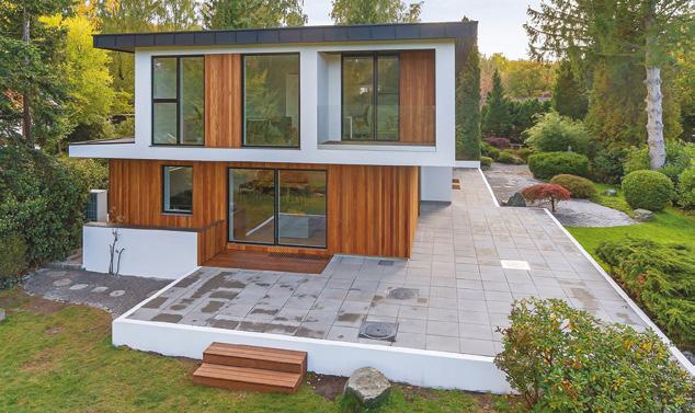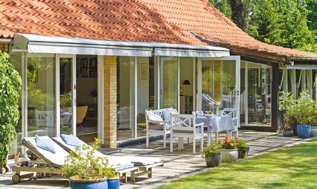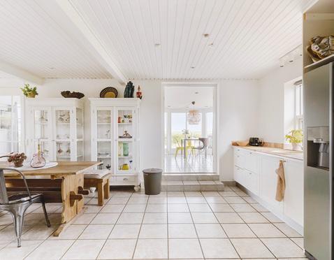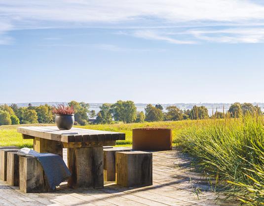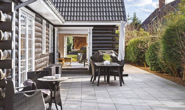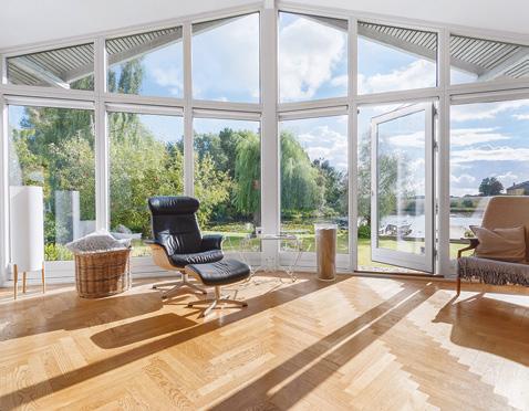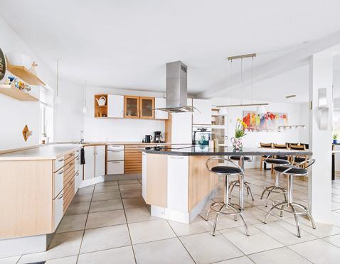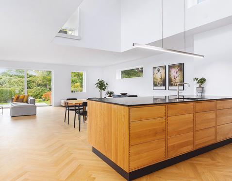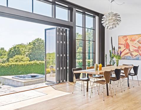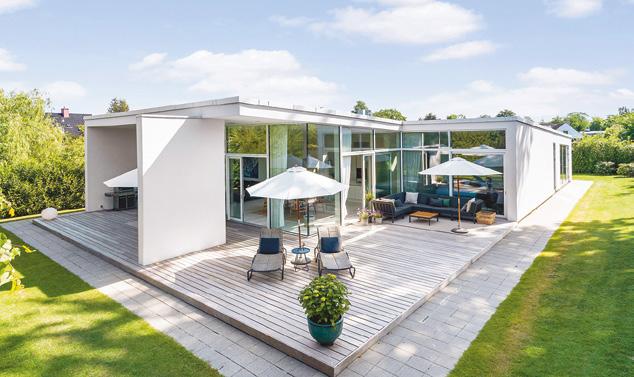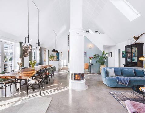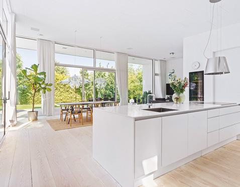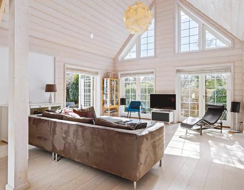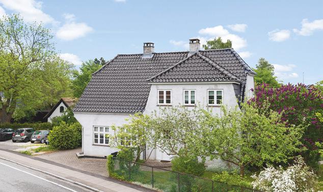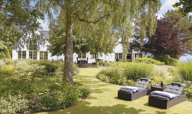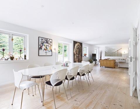 på landet. Men ikke mere på landet end at der bare er få kilometer til indkøb og de lækre forretninger i Allerød. Her er 302 skønne etagemeter, og huset er opdelt, så forældrene har deres afdeling i den ene ende af huset, og børnene deres i den anden ende. Så er alle glade. Luft-til-vand-opvarmning, godt for økonomien, mange tak for det. Bortset fra et par få vinduer er der kun døre i stueetagen til den sydog vestvendte terrasse. Sol hele dagen, nemlig. Her er ingen trafik, bare fred og ro på den 4.493 m2 store grund.