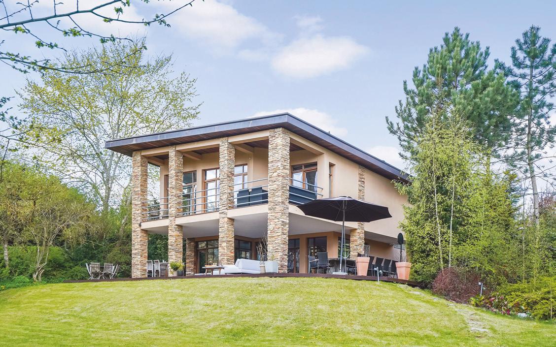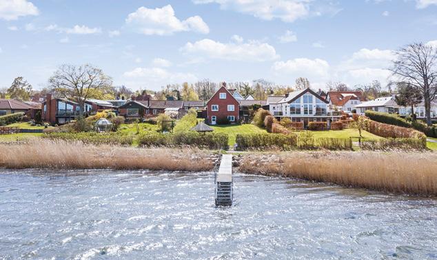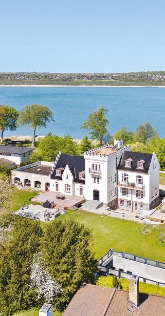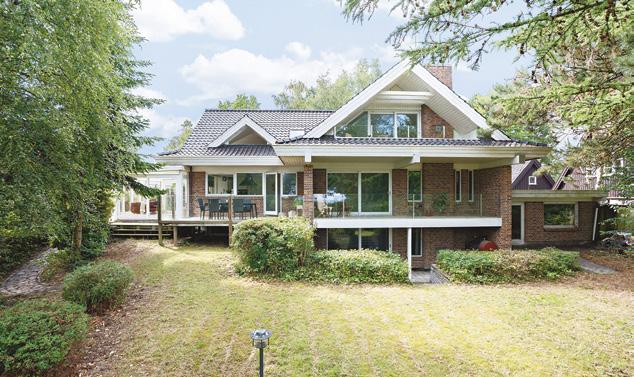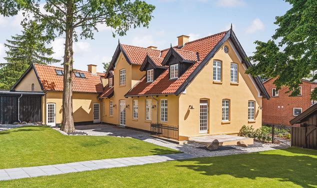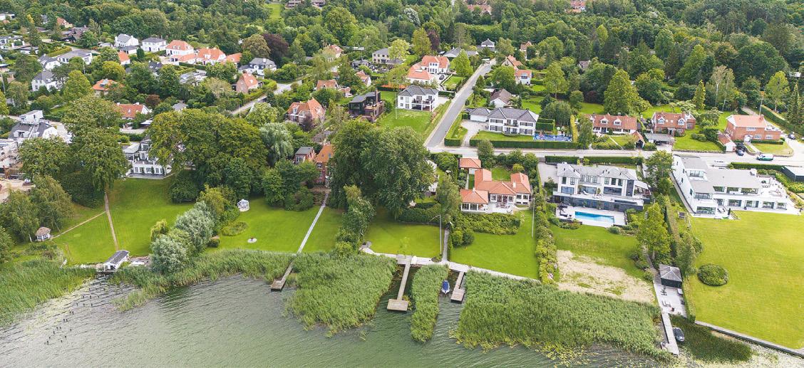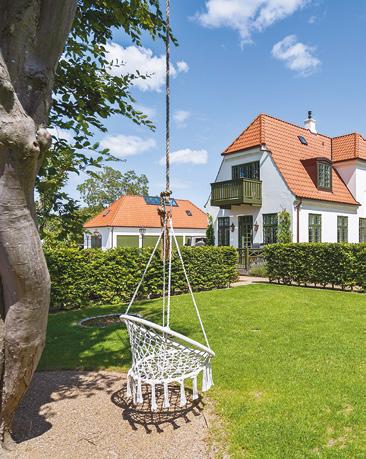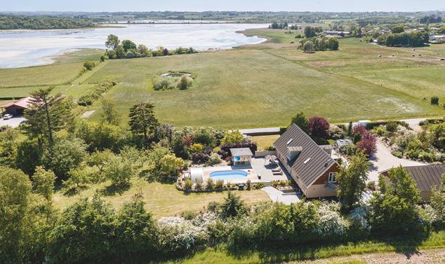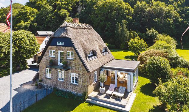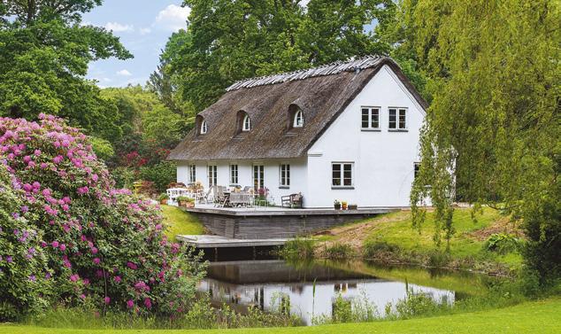 etager. Her er en forældreafdeling med walk-in og eget badeværelse i stueetagen. Første sal med 4 gode rummelige værelser plus badeværelse. Overalt eksklusive materialer og flotte bredde plankegulve. Med stråtag, selvfølgelig, for sådan bygger man i en lille landsby. Med træterrasse som går helt ned til egen sø ligger huset som et lille, ugeneret og charmerende eventyr på den 3.502 m2 store private grund. Med rødderne i søvandet bliver rododendrons store, farverige og potente. Smukt er det hele at skue.