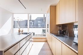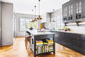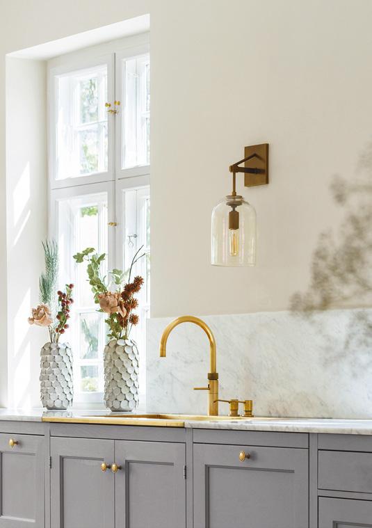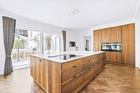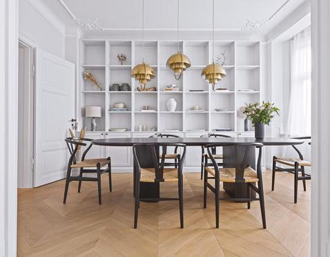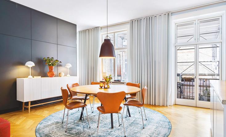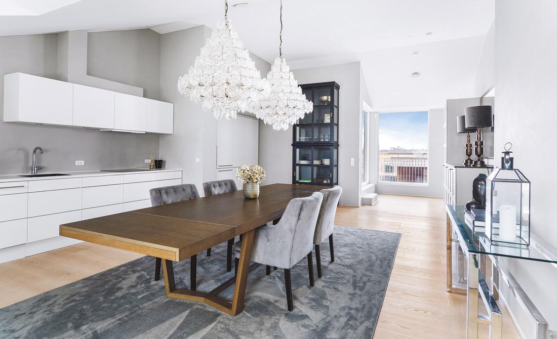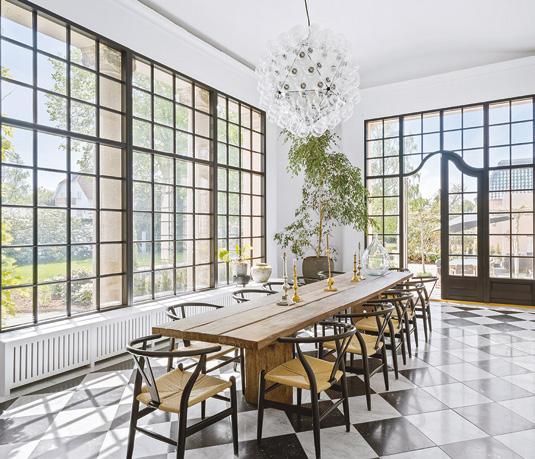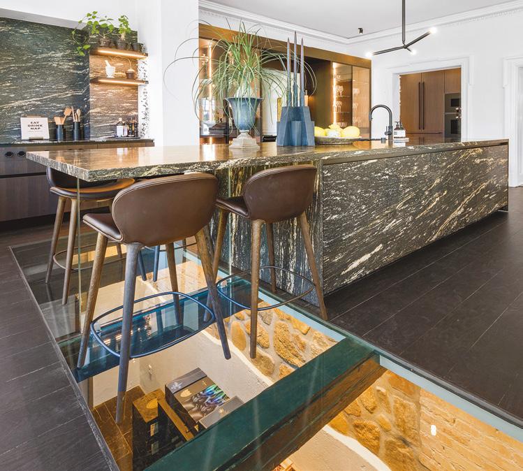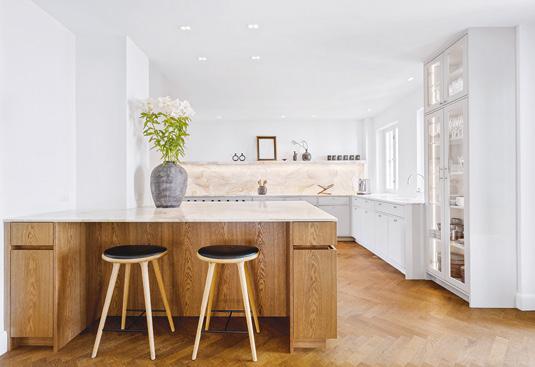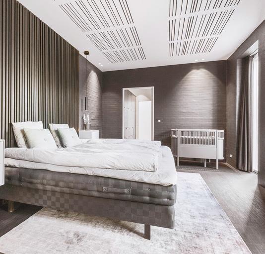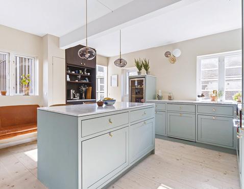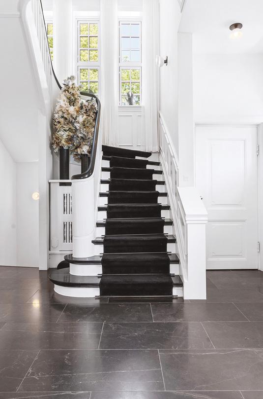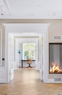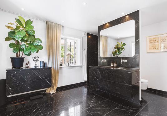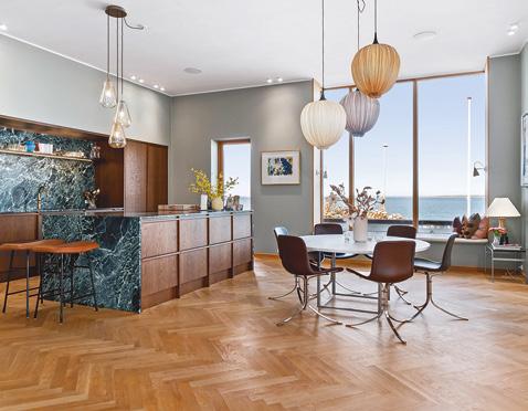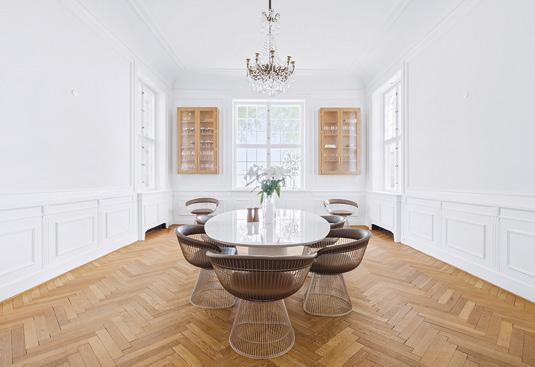 I dag er hver eneste af de 900 etagemeter ude og inde renoveret så smukt og beundringsværdigt af en familie med samme nutidige overskud som familien for over 100 år siden. Altså ingen skelen til hverken tid eller økonomi. Omfattende og bekosteligt har processen været, alle materialer er valgt fra absolut øverste hylde, og det giver slet, slet ikke mening at opliste leverandører og valget af materialer her, for den er lang som en brochure, som udleveres ved besigtigelse. Den korte version er et bespoke granitkøkken fra italienske Boffi, en vinkælder med glasloft til køkkenet bygget af Malte Gormsen Møbelsnedkeri, massive egetræsplanker overalt og natursten i alle 6 badeværelser. Med 3-lags-vinduer har ejendommen energimærke