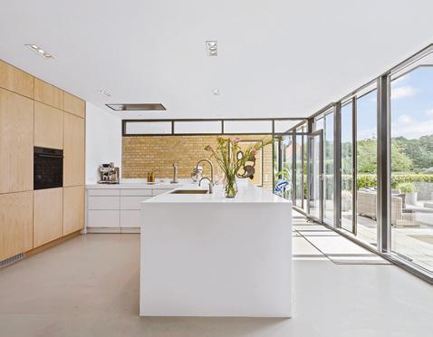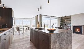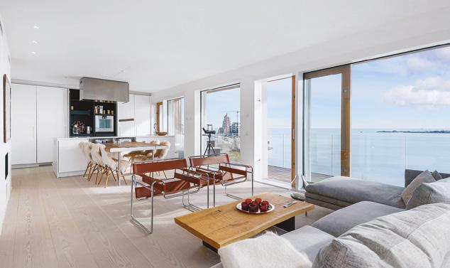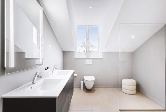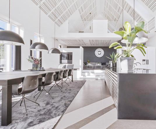 stemning, varme og New Yorker vibe, varme i gulvet under de gennemgående polerede betongulve, hvidt minimalistisk, grebsløst køkken og indbyggede træskabe i lys ahorn, antracitgrå vinduesrammer som skaber en smuk indramning af den vidunderlige udsigt. Det er et hus, som med store rum på forskellige niveauer åbner sig mod naturen. Åben adgang til god kælder med skønt vaskerum, mulighed for træningsrum, gæsteværelse, hobbyrum, kontorplads, vinkælder og opbevaring.