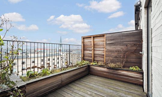 Etagen er et tidligere tørreloft bygget om i 2010 til en de mest spændende og sjælfulde lejligheder i København. Tårnets kuppeltag med guldbelagt vejrhane er netop skiftet, facaden renoveret i år, ligesom trappeopløb og porthus også er nylig renoveret. Alt står spitzenklasse uden projekter de næste mange år. Lejligheden, ja, den er så uforskammet lækker med bruser på den sydvestvendte terrasse. Kun fuglene kan kigge med, og de pifter og blinker med det ene øje, når de flyver forbi. Alle 167 m2 er lige til at flytte ind i.