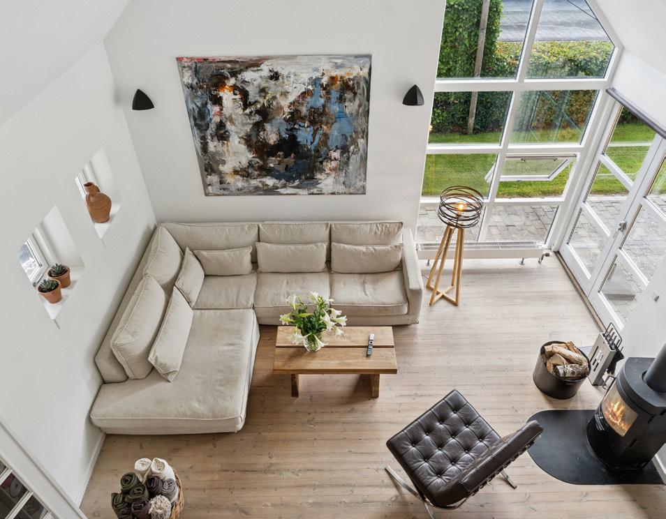 volleyballnet, badebroer og flødeis i hele ansigtet. Men det er også en by med egen kystbanestation og forretninger og supermarkeder. Vedbæk Skole ligger bag stationen, det samme gør skoven og de smukke tennisbaner. Og så blomstrer kulturen i Vedbæk med Havnedag og Kulturnat. Som et af de sidste huse i den nordlige ende af Vedbæk står et arkitekttegnet hus fra 1952 på Elmevej. Men her gør vi lige en hurtig afstikker og spoler frem til 2020, hvor huset blev bygget til, så det i dag er på 270 m2