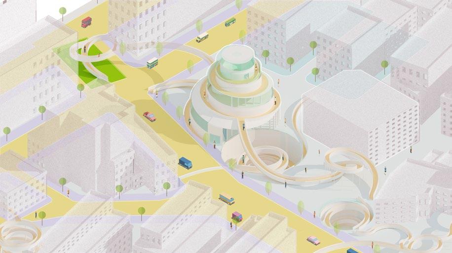1. keep three cvlinders and establish basic building blocks within the base range 2. The clinder structure is retained as the inner courtyard of the building. 4, reduce the volume of three layers and form the tortuous streamlines of the winding cylinder.