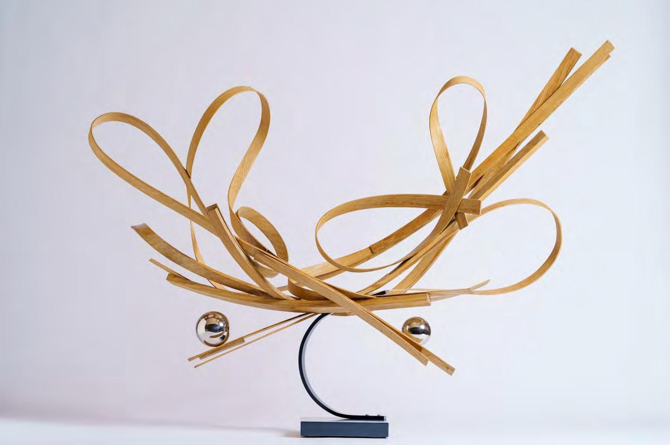 English Oak, steam bent, laminated, laquered and waxed, with polished stainless steel spheres, on a painted base