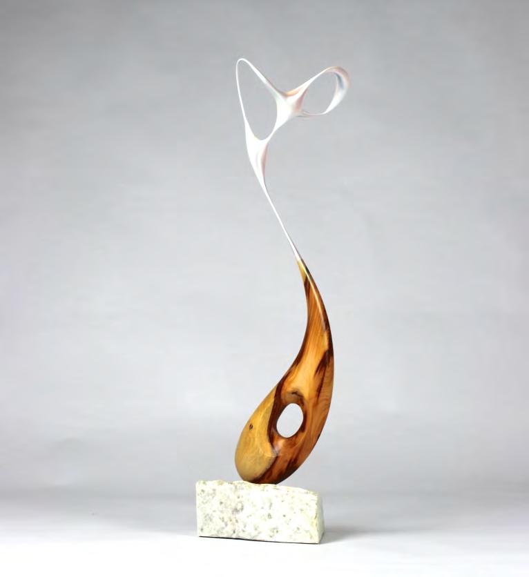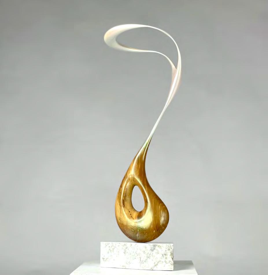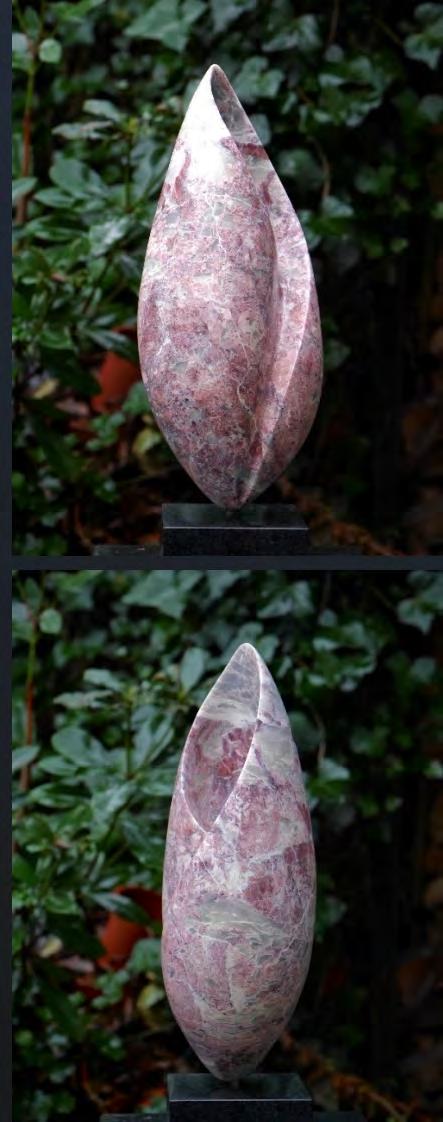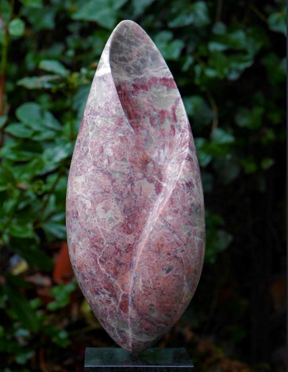 Carved Yew with sculpted forms finished in pearlescent tourmaline hues of pink and green, on a recycled marble plinth