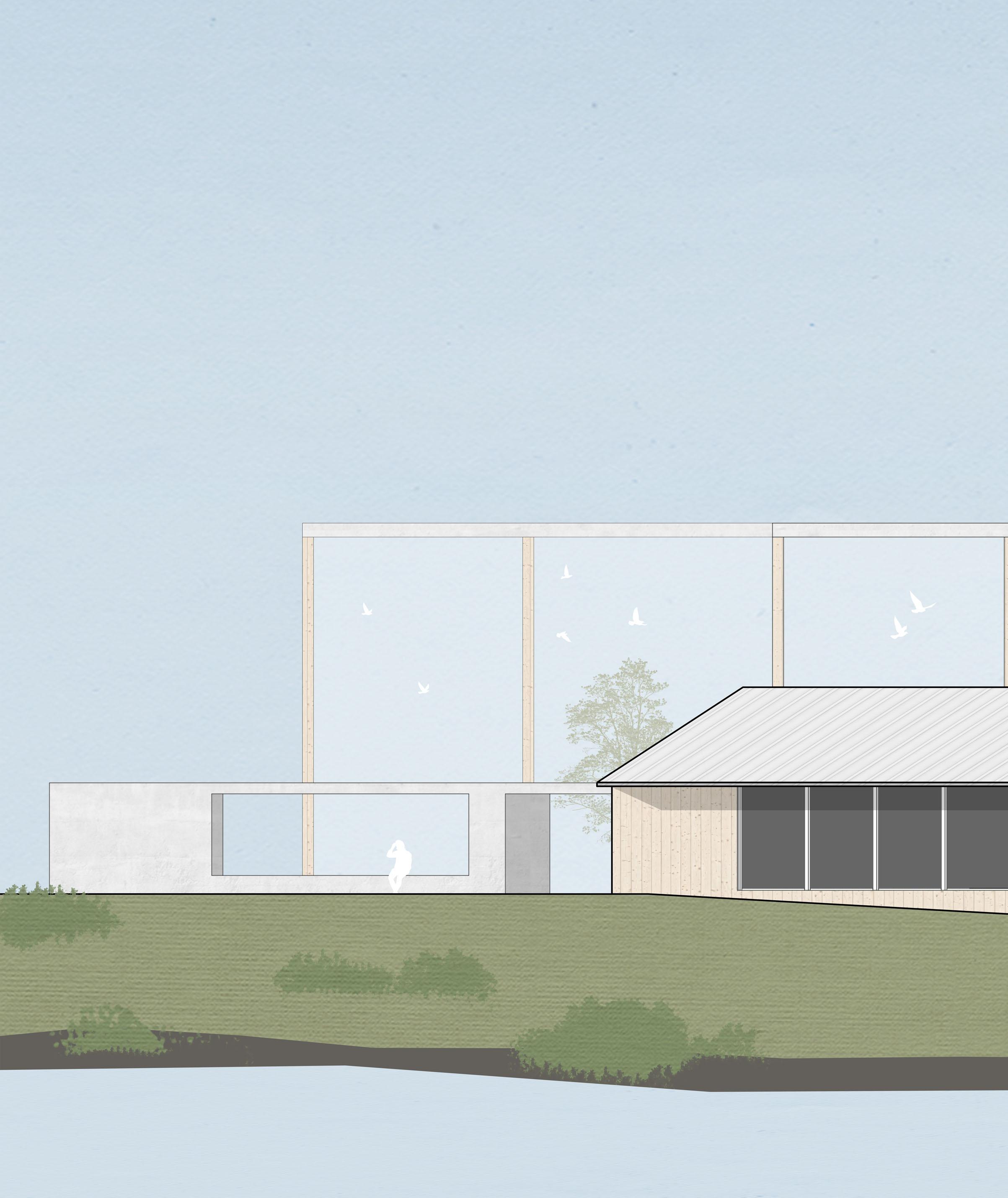 The researcher’s study and classroom are connected, allowing knowledge to be shared easily. The netted aviary provides opportunities for handson education while supporting the rehabilitation of birds for release back to the wild. The researcher’s residence is a separate space which offers views of the lake and surrounding scenery. The Crossing Aviary’s layout and strategic placement allow for both public engagement and private living, creating a harmonious balance between the two.