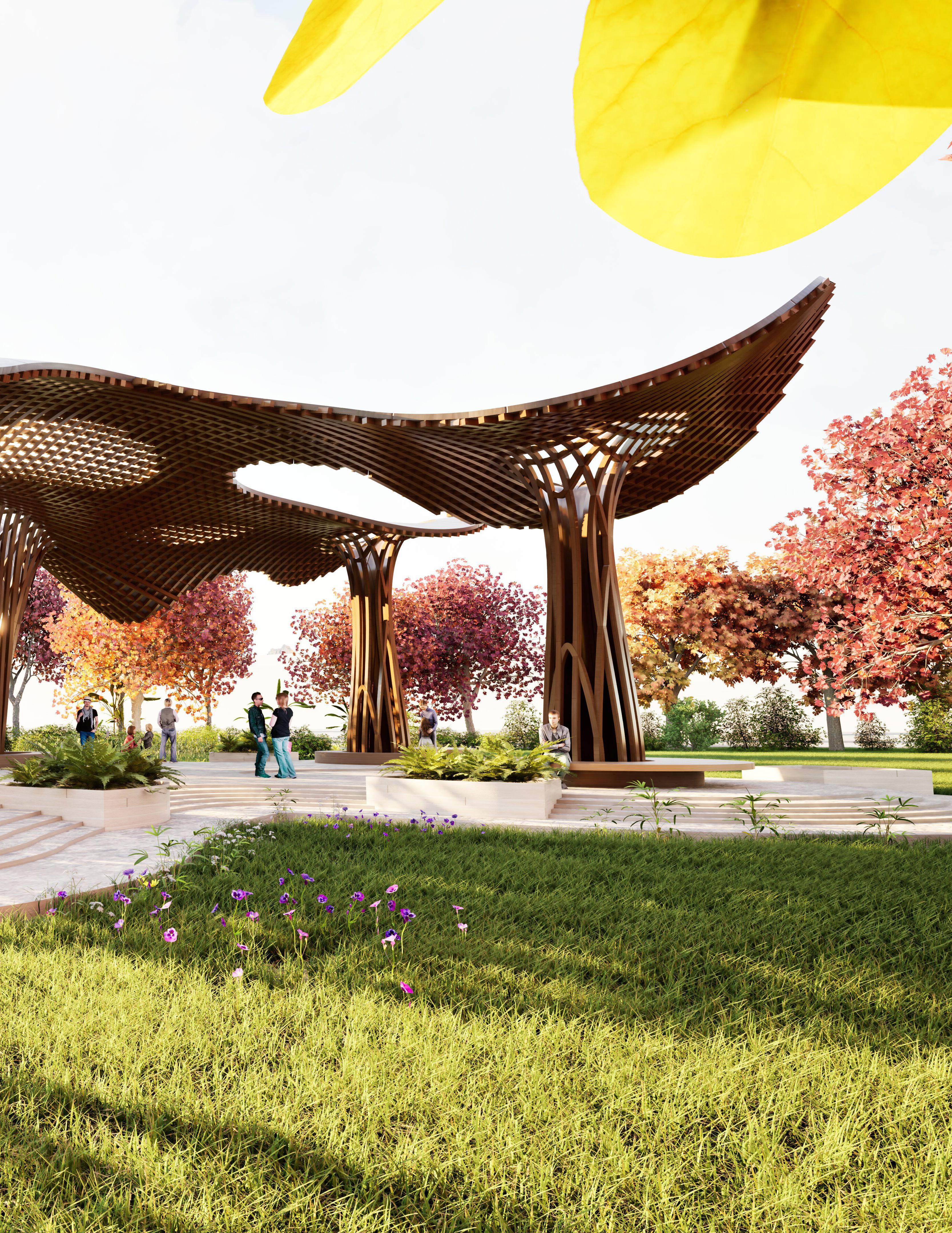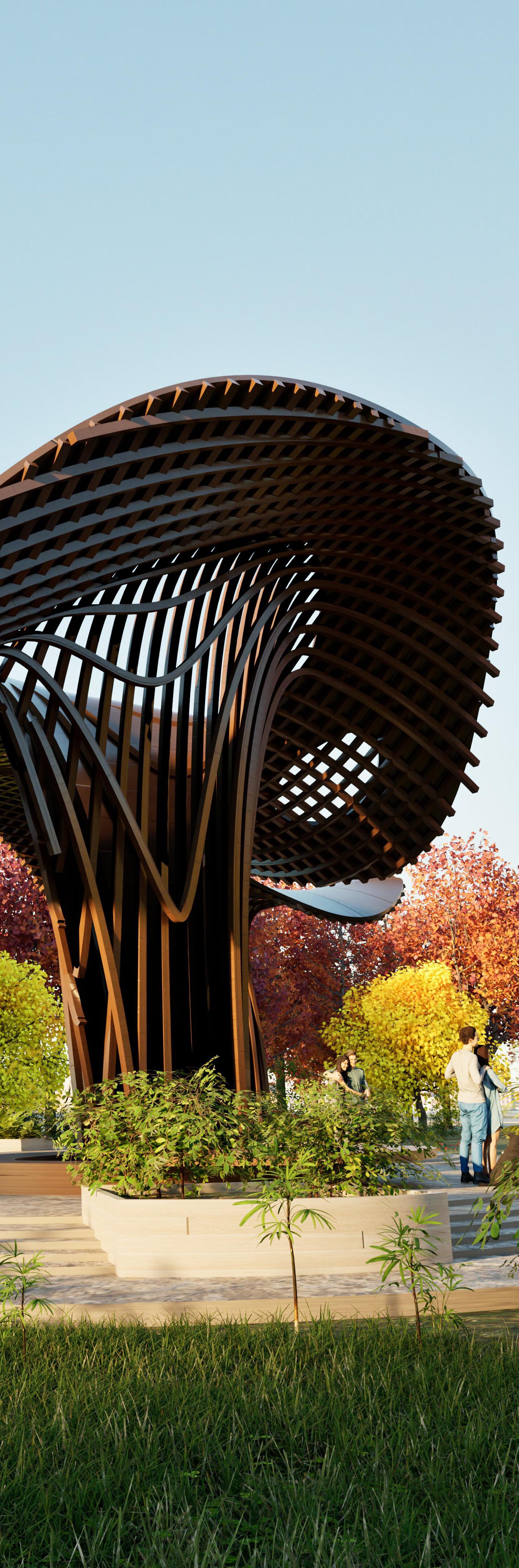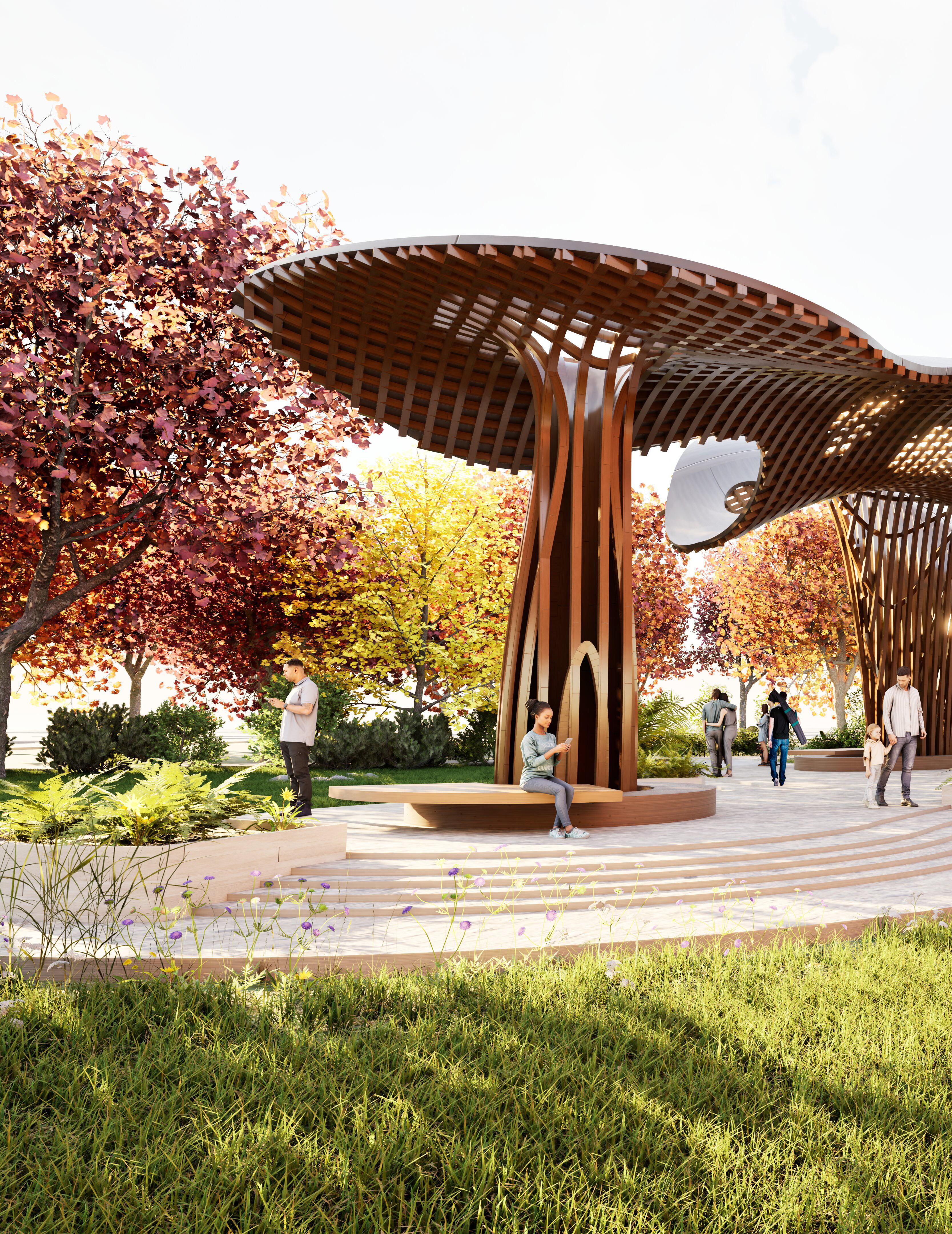 The pavilion stresses sustainability and workmanship, with the material’s natural warmth complementing the organic look. The roofscape is inspired by the texture of a mushroom cap, with an undulating, textured surface that mimics the delicate yet enduring patterns found in its growth. This roof is intended to give both shade and shelter, with small openings that allow natural light to stream through, mirroring how sunlight moves through a forest canopy.
