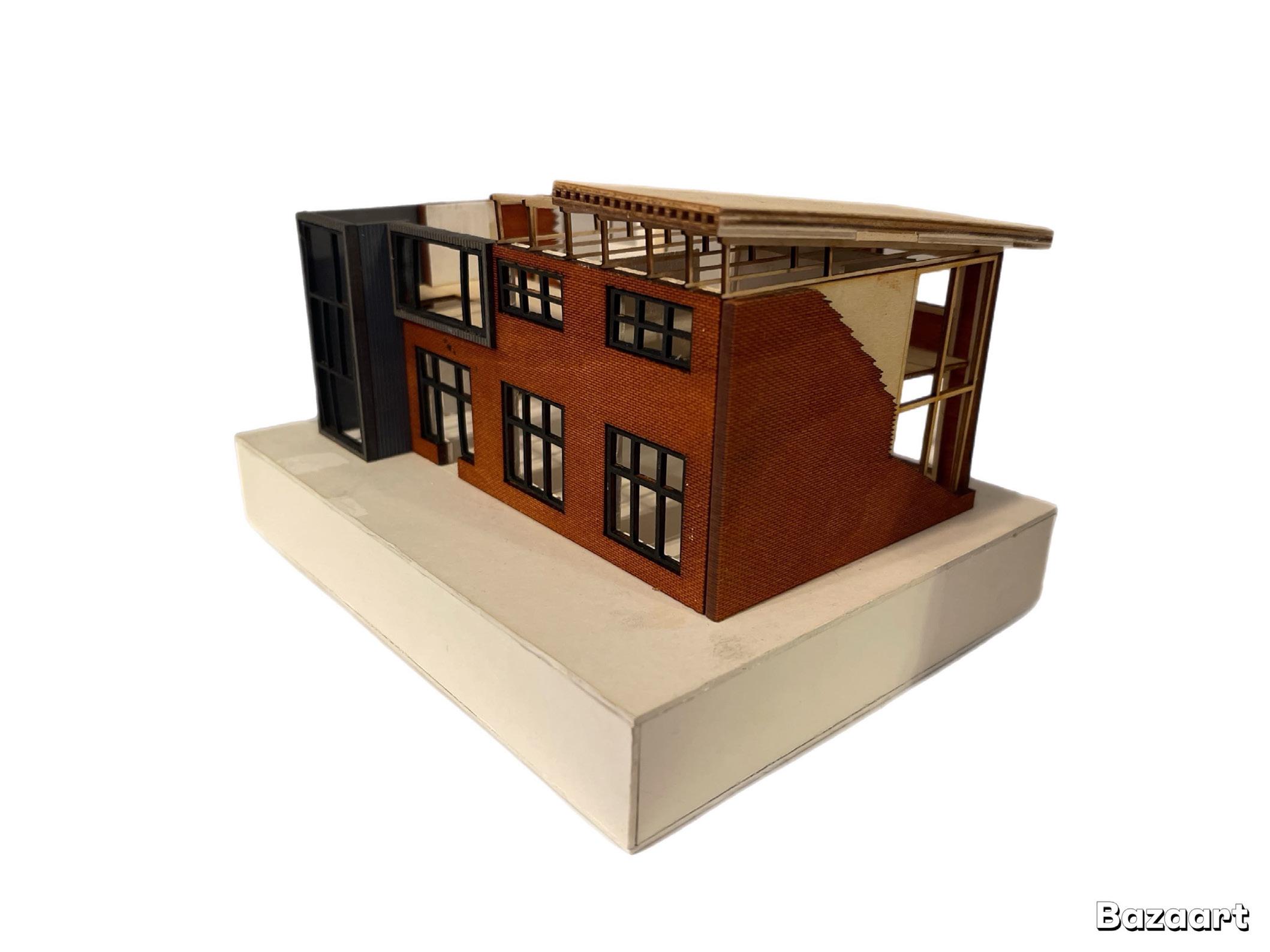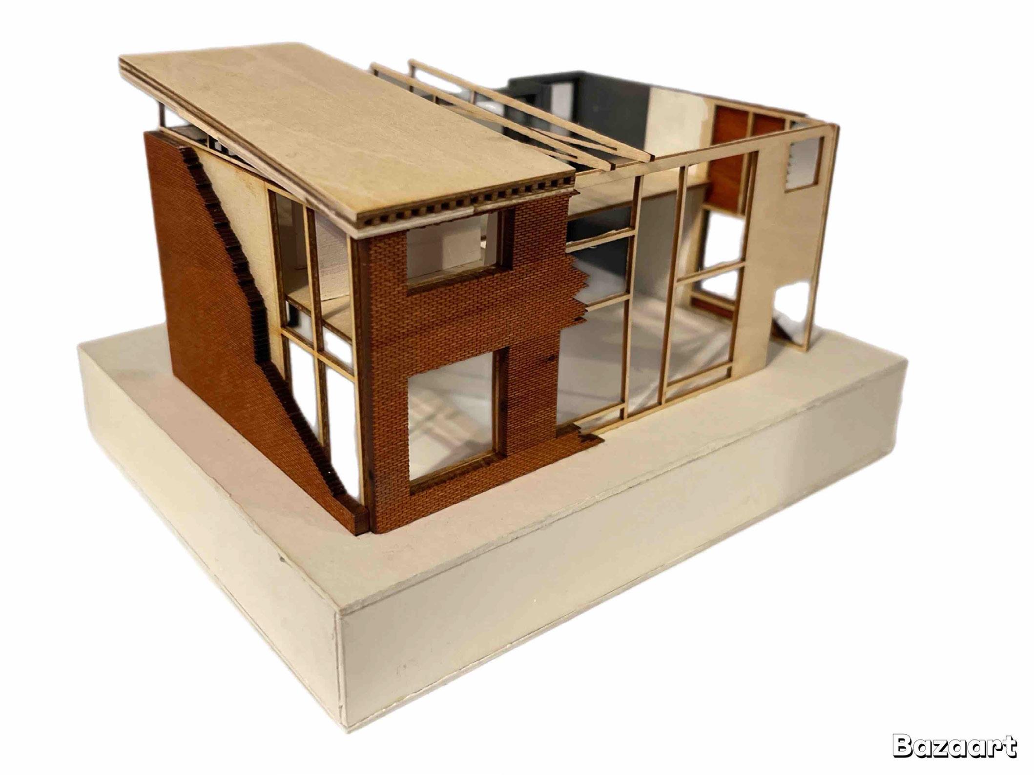 Material choices focus on modern aesthetics such as painted brick, wooden frame, and plaster