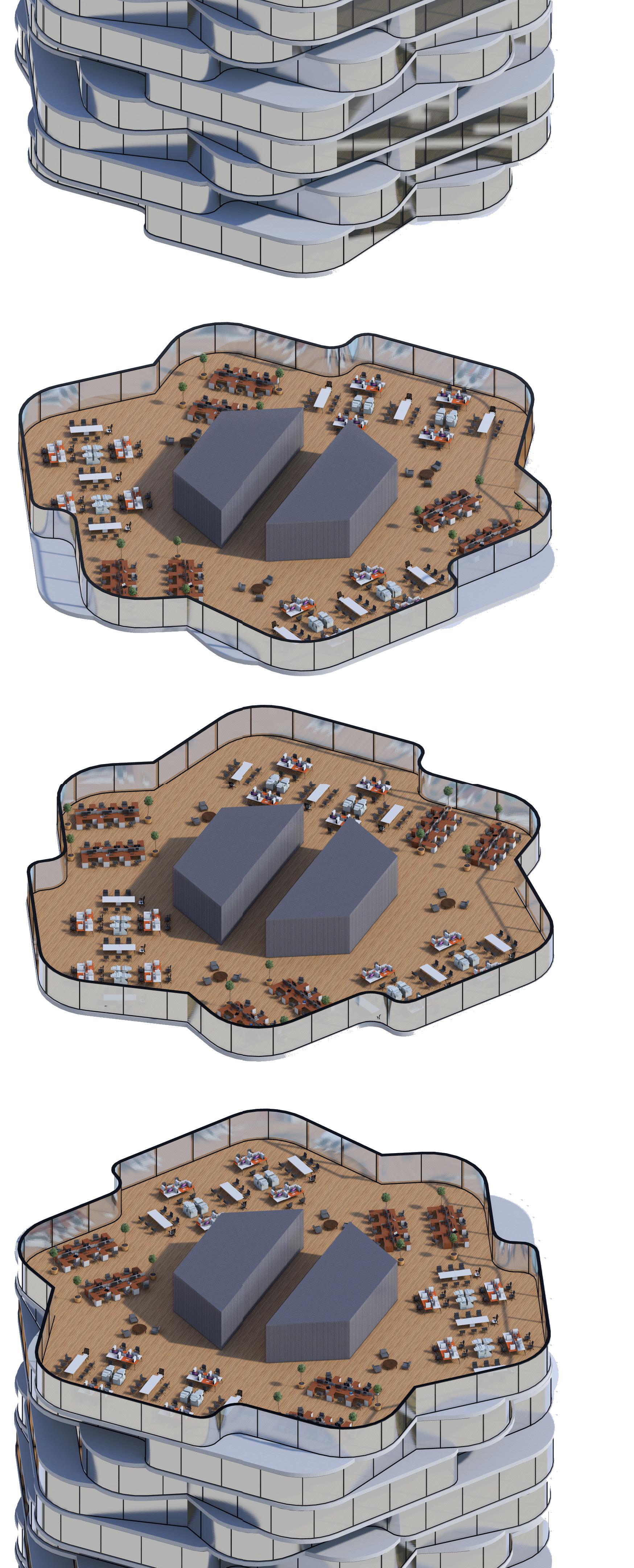 A posh hotel located above the shopping area provides services to visitors, including direct access to outdoor terraces that are filled with natural elements and serve as urban retreats for rest. Expanded office spaces offer flexible design for contemporary work settings. The upper floors host premium residential apartments, later finishing off with a rooftop restaurant at the top.