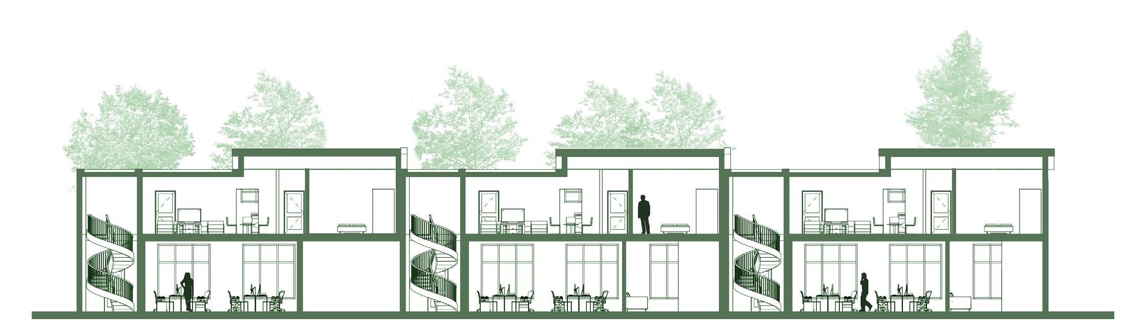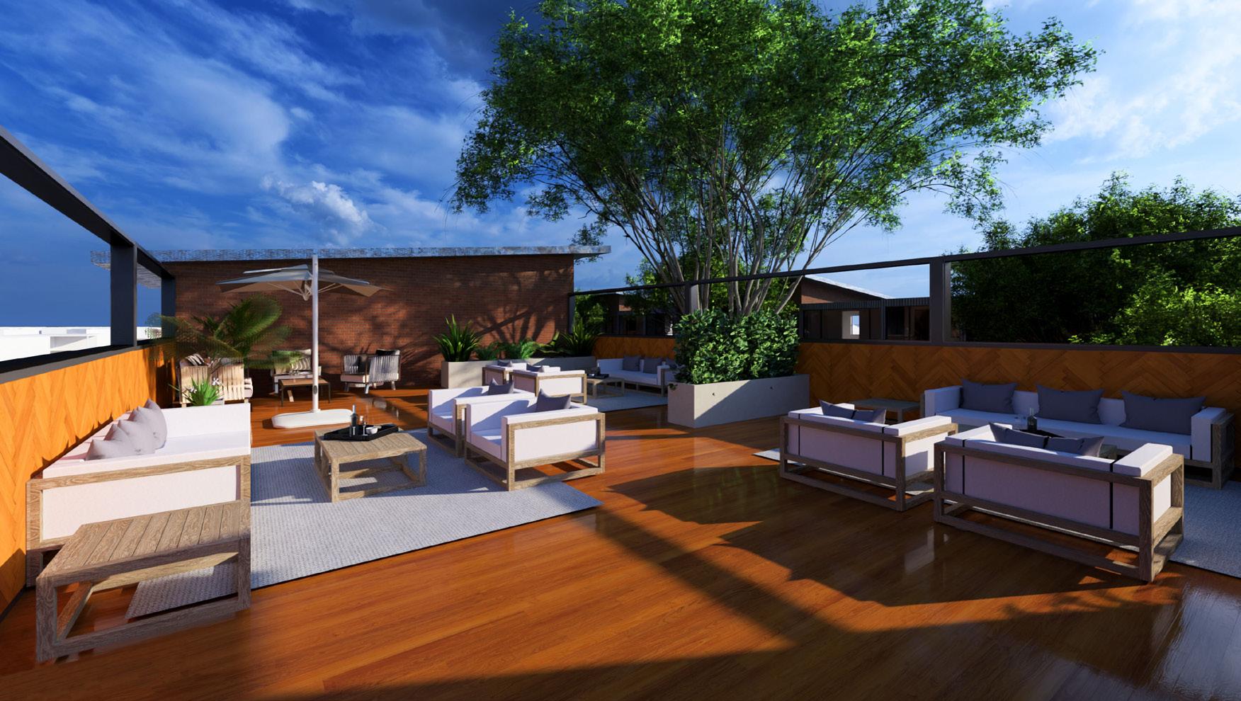 The residential units are located on the higher levels, providing intimate but comfortable living spaces with views of the social areas. Rooftop terraces and shaded patios expand the living space, encouraging outdoor interactions. The use of vegetation, outdoor dining, and shared amenities underscores the project’s goal of creating a close-knit community in this dynamic urban setting.