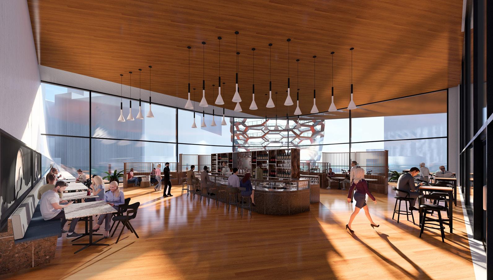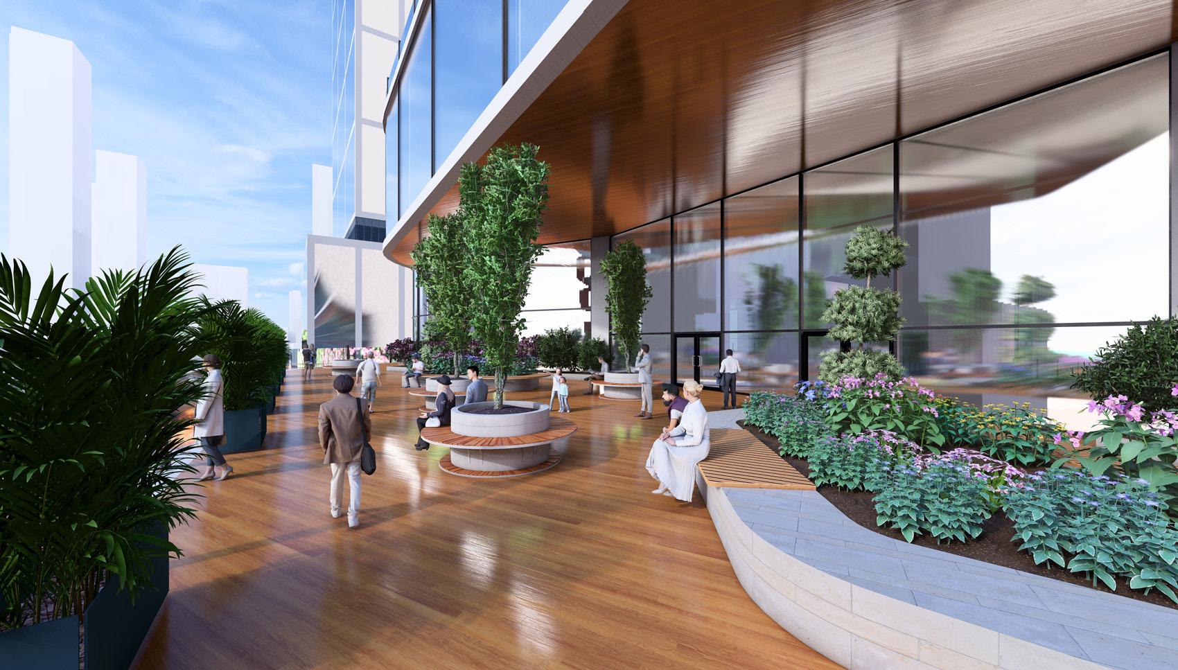 A dynamic series of spaces is provided by the program’s vertical organization. A public plaza on the bottom floor greets guests with lush planting and sitting sculptures that encourage social interaction. An open atrium that runs upward through the lower floors, visually integrating retail areas with natural light and plants, anchors the lobby’s seamless transition into multi-level retail spaces.