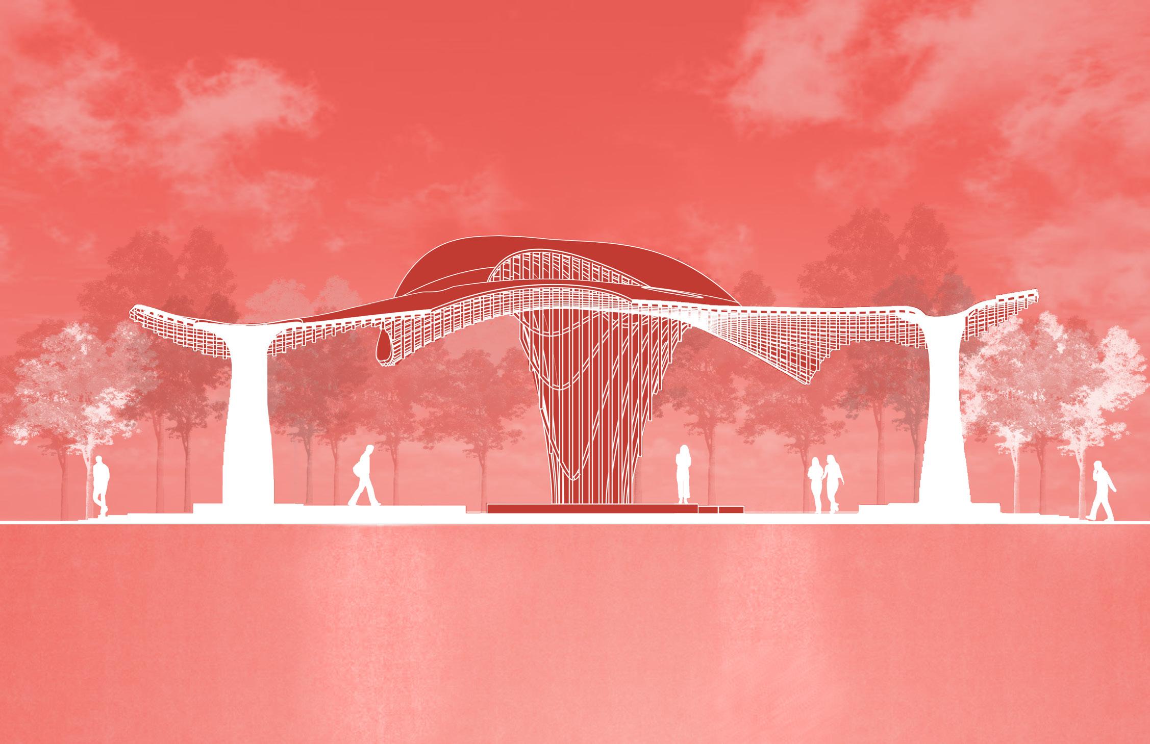 The Hyphae Haven Pavilion is an architectural idea inspired by mushrooms’ complicated structures, with a design concept based on the organic network of hyphae. The pavilion’s structural framework, which serves as a guiding element, replicates the branching, web-like appearance of hyphae, resulting in an interconnected network of slender wooden supports that stretch and link throughout the area.