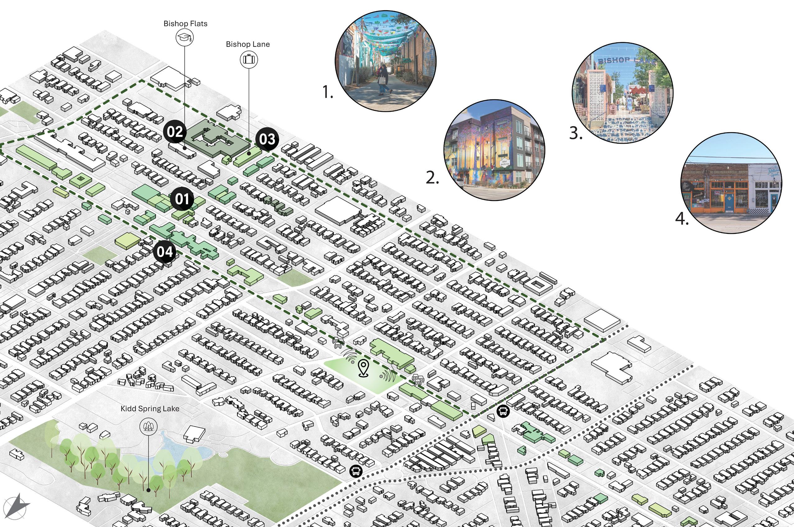 Bishop Works is a live-work townhome project located in the heart of Dallas’ Bishop Arts District, designed to foster a sense of a micro-community while embracing the area’s vibrant cultural identity. The project adopts a mini-village layout, where interconnected pathways and communal gathering spaces encourage social interaction and neighborhood engagement.