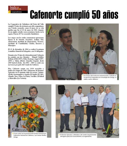 La Cooperativa de Cafetaleros del Norte del Valle cumplió 50 años de existencia, por ello compartimos con Ustedes recuerdos como el inicio de su vida jurídica que fue el 10 de mayo de 1963, después de un amplio estudio socio-económico hecho en la región. Fueron 367 los asociados fundadores. Los cargos con los cuales comenzaron operaciones fueron el de Gerente, Secretario, Auditor, Fiel, Almacenista, Ayudante de Almacenistas, Tesorero, Ayudante de Contabilidad, Celador, Braceros y Mensajero. El 23 de diciembre de 1964 se realizó la primera Asamblea General de Delegados, con 34 delegados. Durante estos 50 años de vida institucional Cafenorte ha contado con tres Gerentes: Manuel Cubillos Beltrán (1966-1997), Fabio Restrepo Ángel (19972005) y Julián Alberto González Espinal, desde 2005 hasta la fecha. De 1963 – 1965 se contó con un Asesor por parte del Comité de Cafeteros. Hoy, Cafenorte cuenta con 2.034 asociados y puntos de compra de Café y Almacenes de Insumos Agrícolas en el siguiente radio de acción: Cartago, Alcalá, Ansermanuevo, Argelia, El Águila, El Cairo, Obando, Toro, Ulloa, La Unión, Versalles, El Balsal y Miravalles (La Victoria).