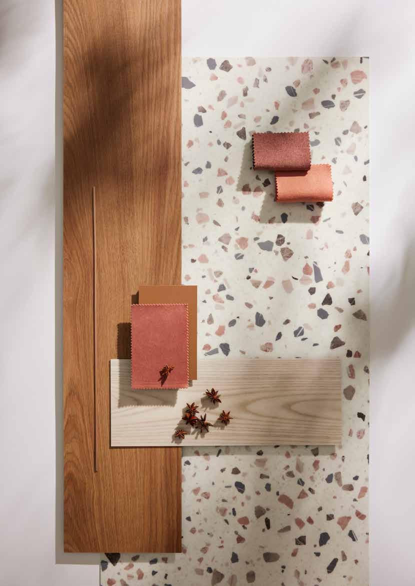 Feel the need to unwind when you come home? Surround yourself with warm, soothing colours like earthy browns and terra tones and find some peace of mind among the infinite landscapes of the desert. Or bring a hint of those endless sand plains indoors with a light natural stone or subtle terrazzo combined with a weathered wooden surface. Little hints of rose gold will add a spark of elegance.